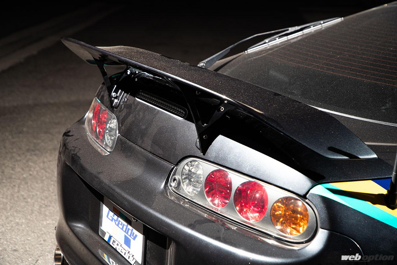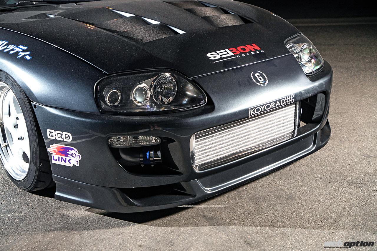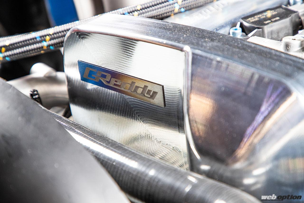 この車両のためにTRA京都の三浦さんがデザインし、ワンオフで製作したバンパー、サイドスカート、リヤウイングを装着。それにSEIBONのカーボンボンネットも組み合わせ、ショーカーらしいグラフィックとともに仕上げた。大開口のフロントバンパーから覗くインタークーラーも、もちろんGReddy製だ。