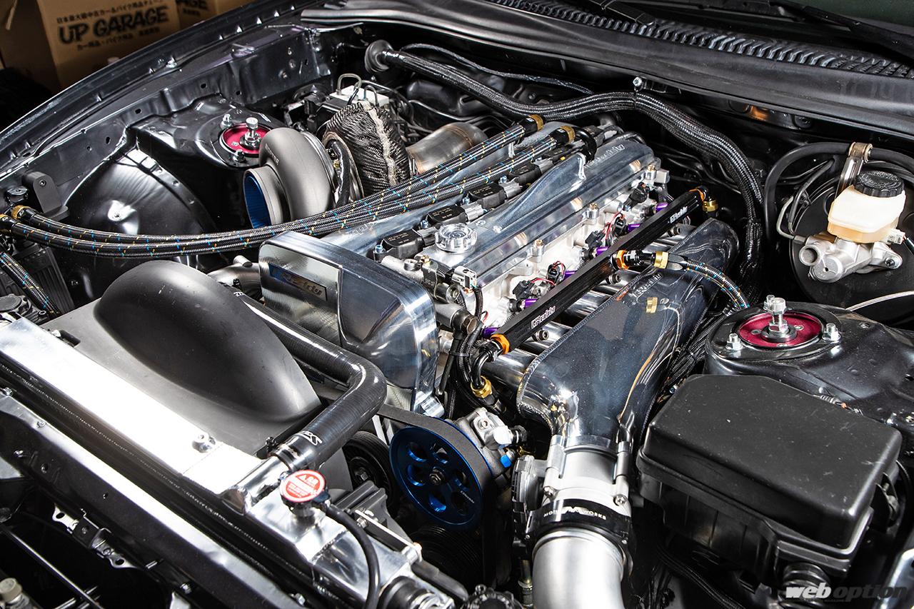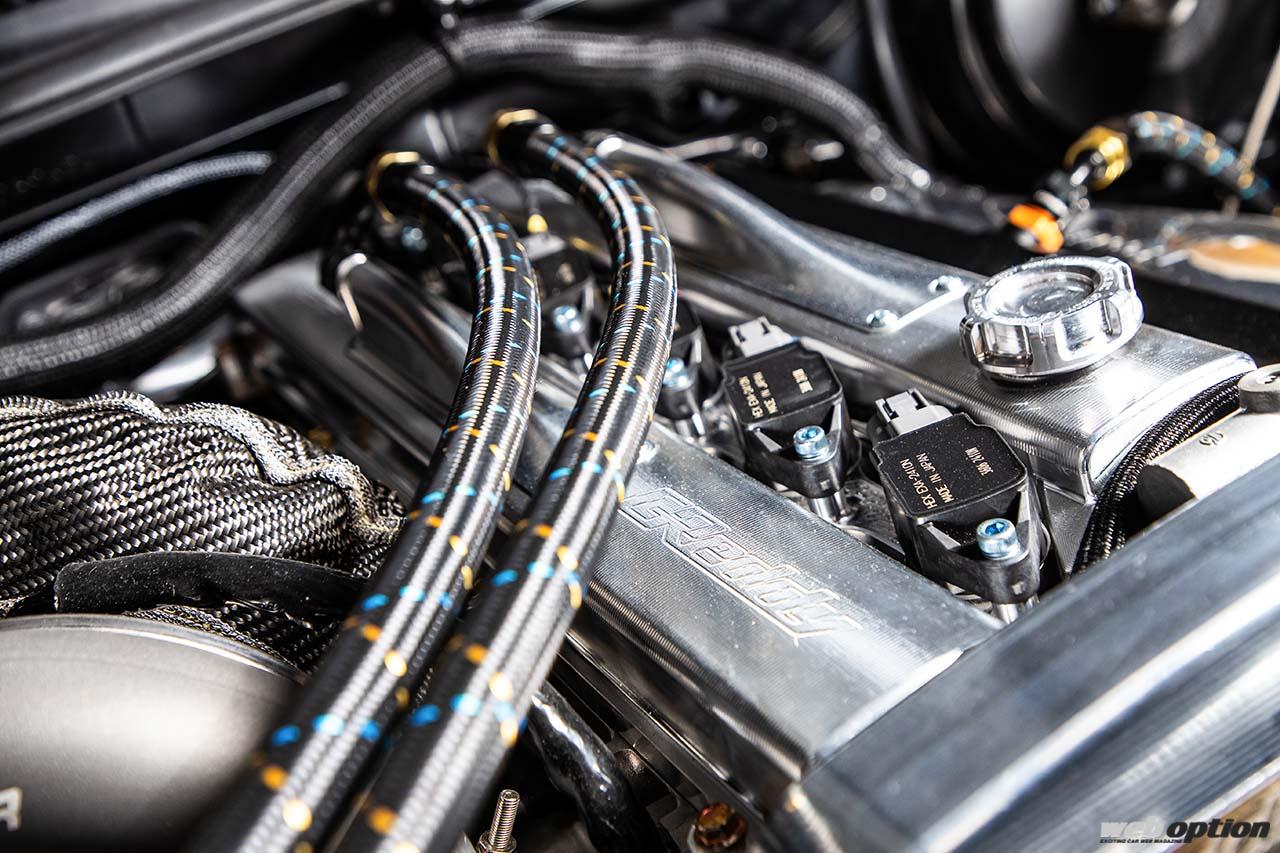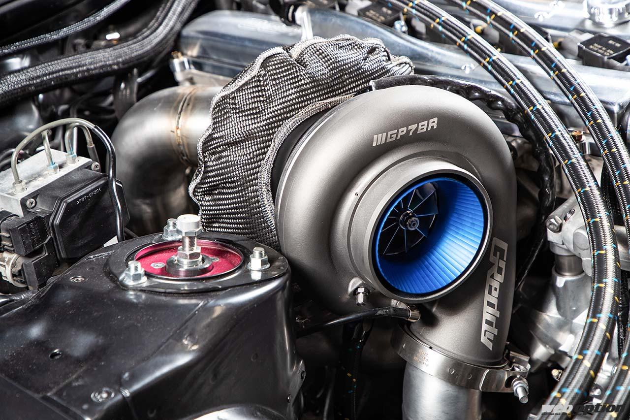 ワンオフのエキマニを介して装着されるタービンはGPPオリジナルのGP78R。吸気系は、GReddy製サージタンクに電子制御スロットルを備える最新仕様だ。