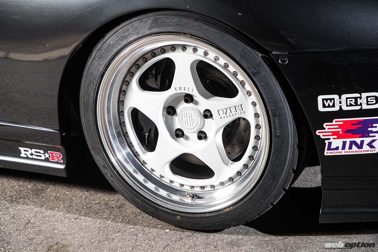 足元には、KMG(KOSTRITZER MASCHINEN GESELLSCHAFT)というメーカーのマグネシウム製ホイール『KMGT-1』を装着。マグネシウムのディスクとアルミのリムを組み合わせた2ピースで、チタン製のハードウェアで固定するという、拘りの逸品。タイヤはNITTO製で、特にリヤにはNT555Rというドラッグラジアルを備える。サスペンションはアメリカにも進出しているRS★Rのコイルオーバーを使用し、ローダウンさせている。