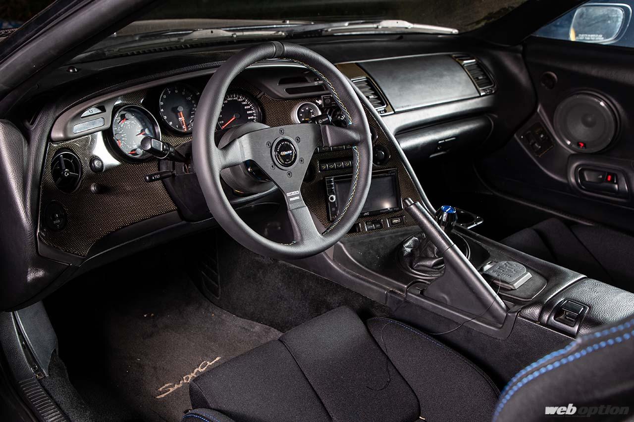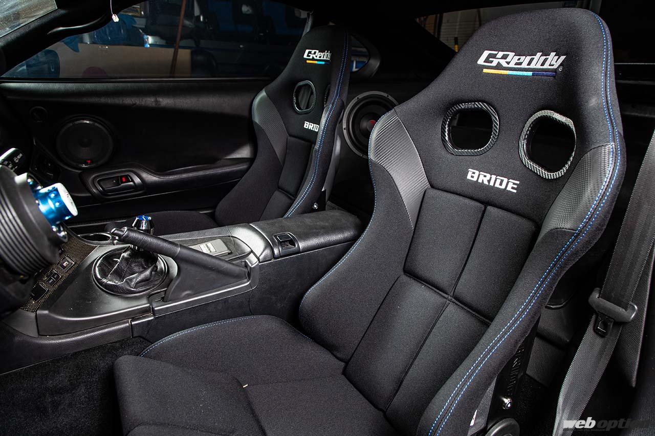 レザーステアリングはGReddyとMOMOのコラボ商品で、モンテカルロをベースにGReddyカラーのステッチが施されている。センターマークがスエードというのもオシャレ。シートもGReddyとBRIDEがコラボしたオリジナル商品。この車両にはセミバケットのSTRADIA3が装着されていた。シフトノブもおなじみのAタイプと、GReddyオールスター揃い踏みといった印象。