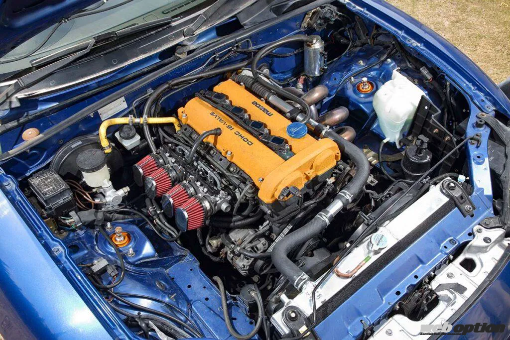 現在のエンジン仕様は腰下ノーマルで、ヘッドは2mm面研とラッシュアジャスター化してNA8用マツダスピードカムを装着。他にもトヨタ純正流用のダイレクトイグニッションなど、注目すべき点が満載だ。