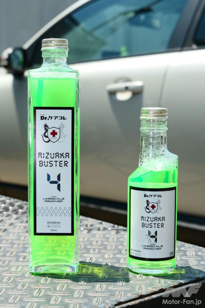 美しいグリーンの液剤は、アルカリ性で強力に水アカを落としてくれる。従来品に比べて水アカ除去性能は、分解力がアップしているのはもちろんのこと、溶剤の粘度が高くなっているのでボディへの付着力が格段にアップ。より水アカを分解しやすくなっている。