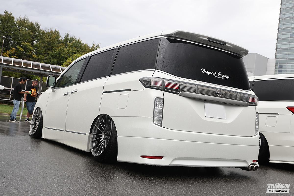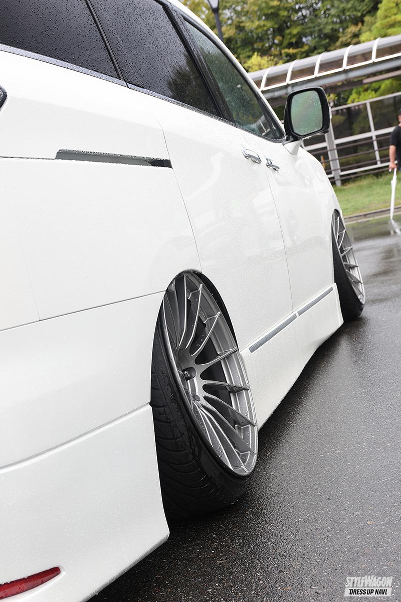 ひなゆいさんは、「元々(E52の)前期は好きではなかった」と言う。しかしマイチェン(今では中期と呼ばれるモデルだ)が行われ、「コレに乗りたい!」と思ったそう。それから6年。昔からカスタムが好きだったこともあり、ココまでの完成度に仕上げた! 「ここ2、3年で急に火が点いた」そうだが。コダワリの足まわりは、この低さを実現するにはエアサスだけではダメ。アームロック等の問題を回避するため、いわゆるフルアーム仕様となっている。前後のキャンバー角にまでコダワリ、完璧なツライチを完成させた。