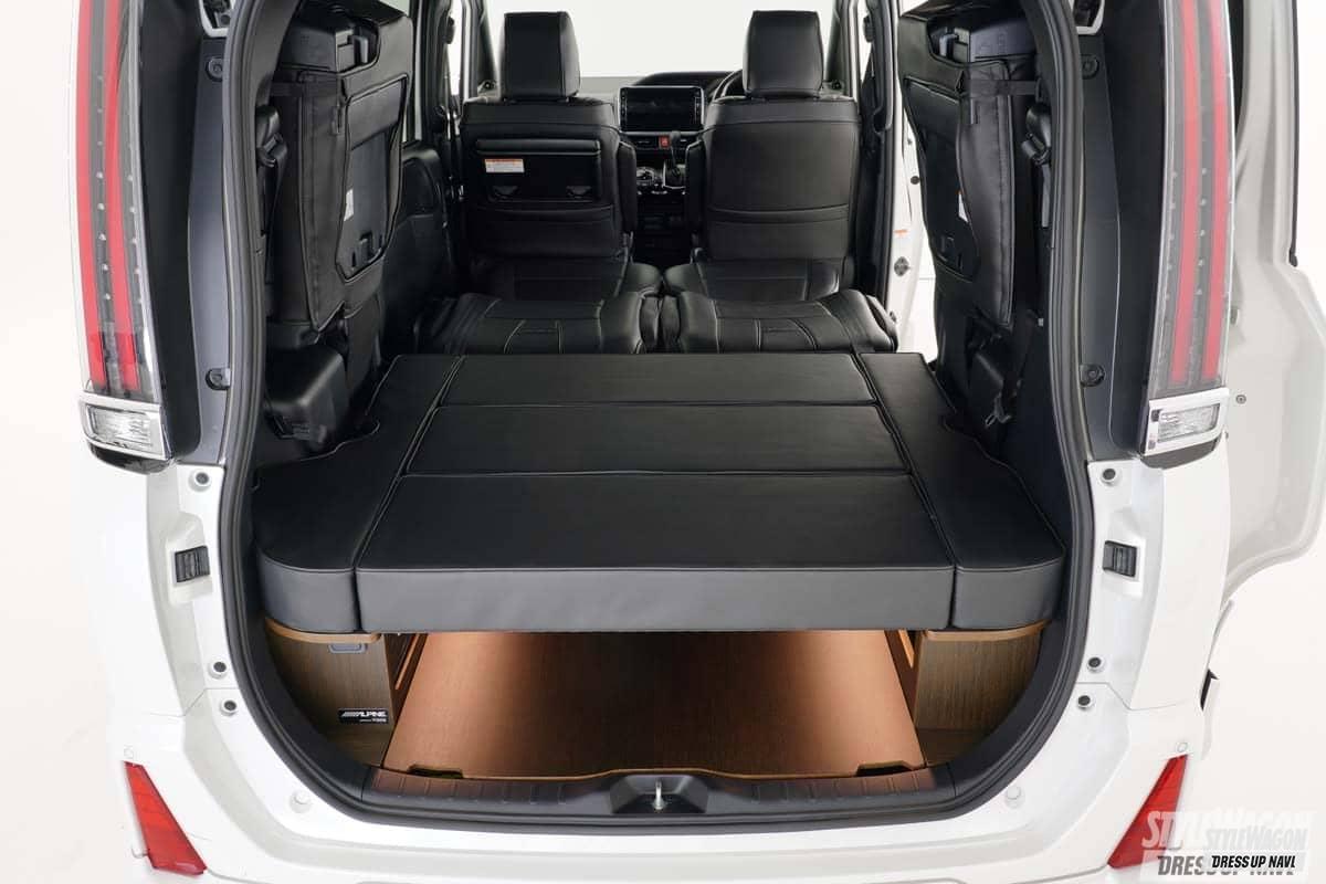 寝心地を追求した厚みのあるベッドキット「プラスステイ」を装着し、セカンドシートをフラットにすれば車中泊も可能な就寝モードになる。