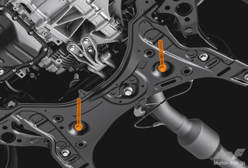 リヤも、サスペンションメンバーをボディに固定するフロント側の六角ボルトを変更した。こちらはフランジではなくボルト頭部の幅を変更。従来の約22mmから約24mmへと大きくした。フロントとリヤで手法は異なるが狙いは同じで、締結剛性の向上である。フロントはステアリングを切り込むとタイロッドがナックルを押す反力がロワーアームに生じ、ステアリングギヤボックスとサスペンションメンバーを固定するボルトをたわませようとする荷重が掛かる。
