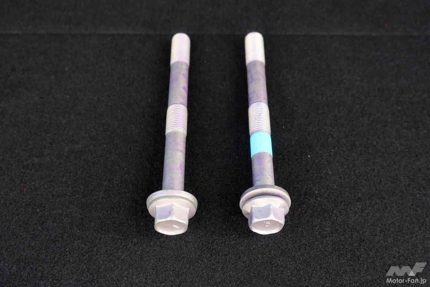 「運転操作に対するダイレクト感の向上」を実現するため、シャシー部品を締結するボルトの一部を“締結剛性向上ボルト”に変更した。ひとつはフロントのサスペンションメンバーとステアリングギヤボックスを下から締結する六角ボルトで、ボルト径はそのままに、頭部の底面についている円形のつば(フランジ)にリブ形状を追加した。