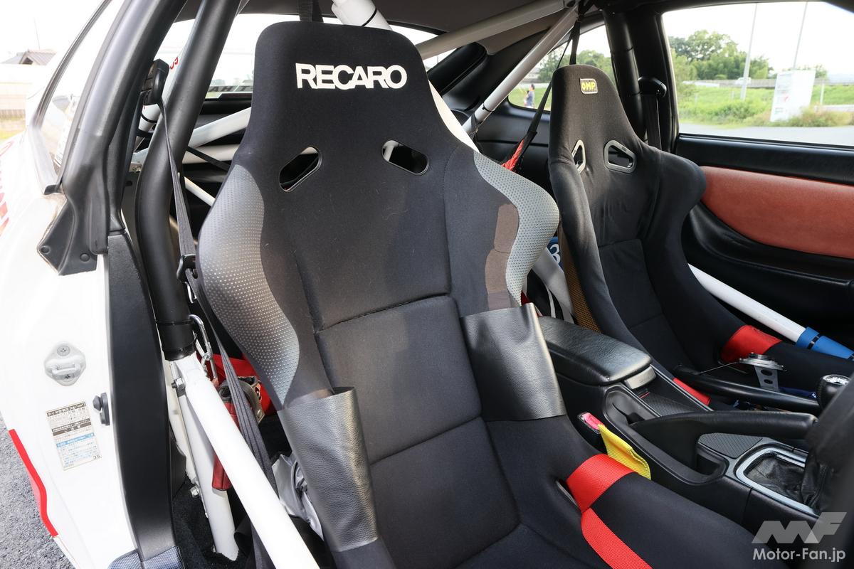 ロールケージは前席のサイドバーに加え、後席は斜行バーを2本設置して2名乗車仕様に。運転席はレカロ、助手席はOMPのフルバケットシートを装着している。普段は使用しないが、どちらにもサベルトの4点式シートベルトを用意している。