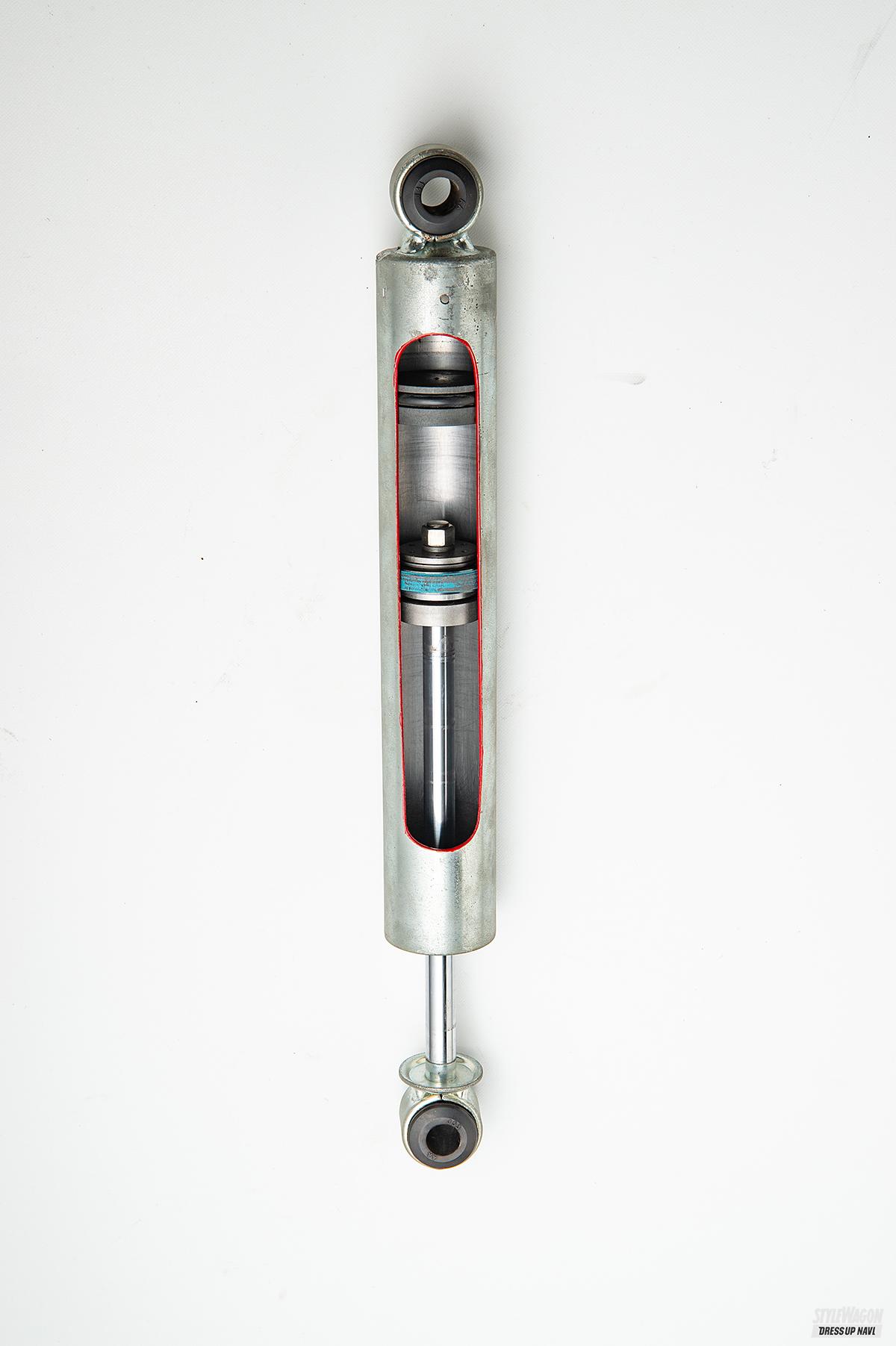 特に力が入る200系ハイエースについては多彩なラインアップを誇るが、ここで紹介するのは定番のモノチューブタイプ。シェルケースは52φ、ピストンロッドは20φと車体に干渉しない最大限の太さを確保。過酷な条件下に晒されるハイエースの足元を力強く支えられる設計になっているのが特徴だ。