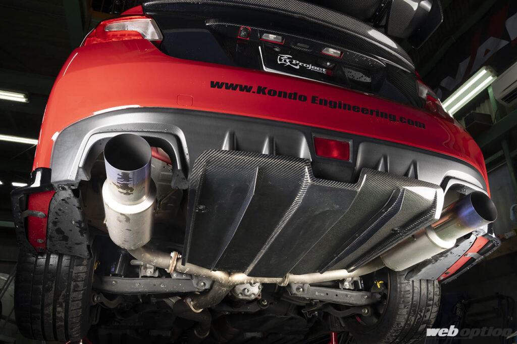 開発最終段階のフロントアンダーパネルは、東京オートサロン2025で発表を予定。装着にはフロントリップスポイラーの取り付けが前提で、画像では中央部に穴が空いているが、ここはオイルフィルター交換など整備性を考えて脱着式を採用する。