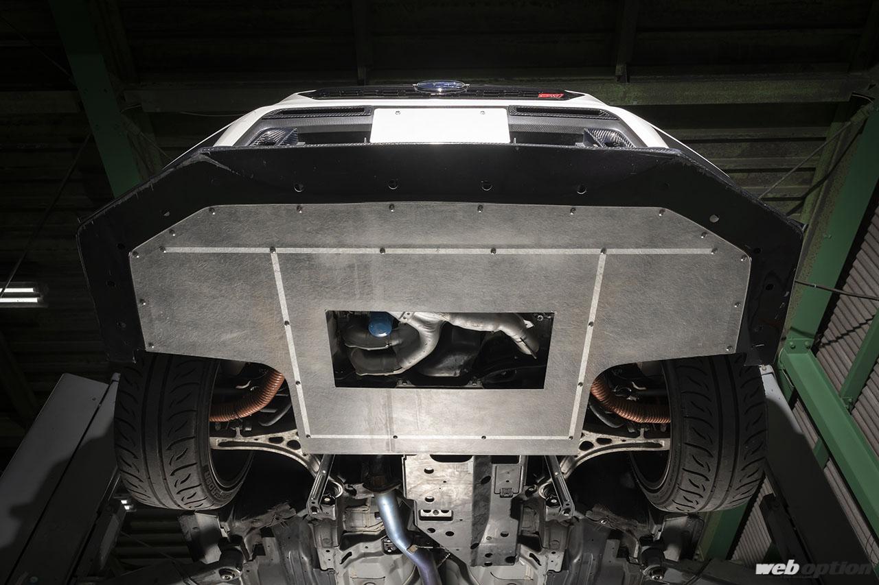 開発最終段階のフロントアンダーパネルは、東京オートサロン2025で発表を予定。装着にはフロントリップスポイラーの取り付けが前提で、画像では中央部に穴が空いているが、ここはオイルフィルター交換など整備性を考えて脱着式を採用する。