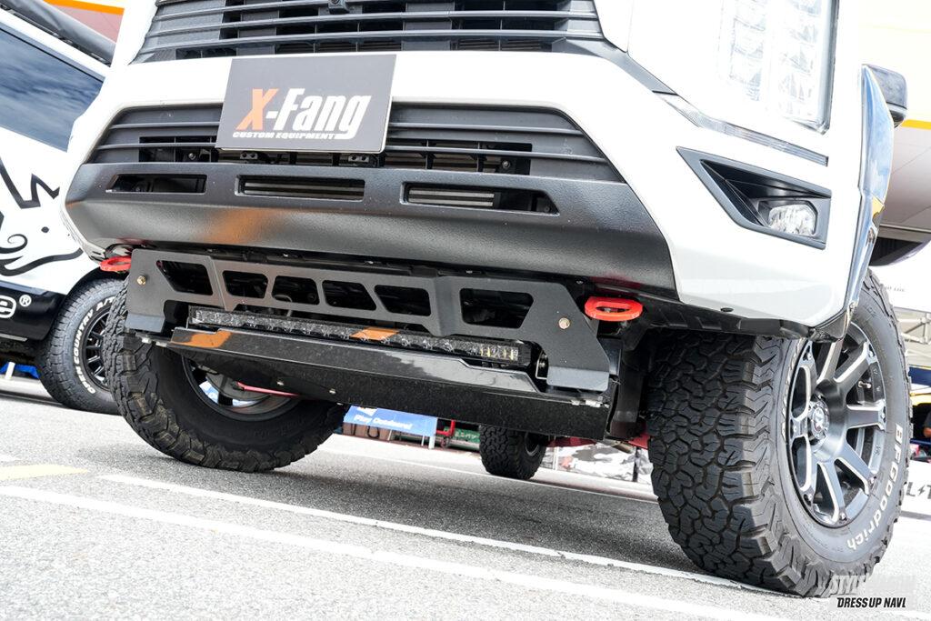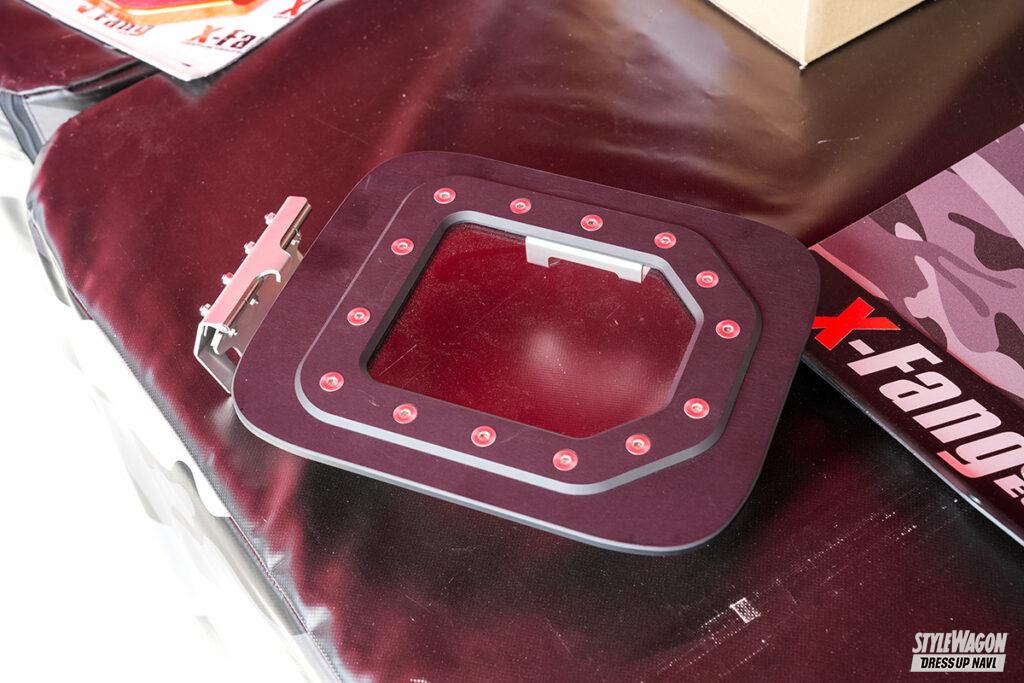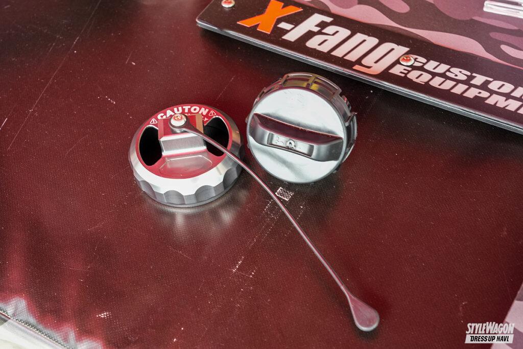 ユーザー目線でのトータルカスタマイズを展開しているクロスファング。スタイルアップはもちろんのこと、デリカの特徴でもある走破性を高めるチューニングアイテムも用意。1台まるごとクロスファングでまとめることだってできるプログラムだ。中でも大ヒットアイテムのひとつが給油口のアイテム。シースルータイプのビレットフューエルリッドと、そのシースルーが活きる最新作、ビレットフューエルキャップカバーのコンビはオフ会参加車にも多数装着されていた。質感高い高品質アルマイト仕上げでアピール度はもちろん、給油時にいつも触れる部分なので装着満足度が非常に高い!
