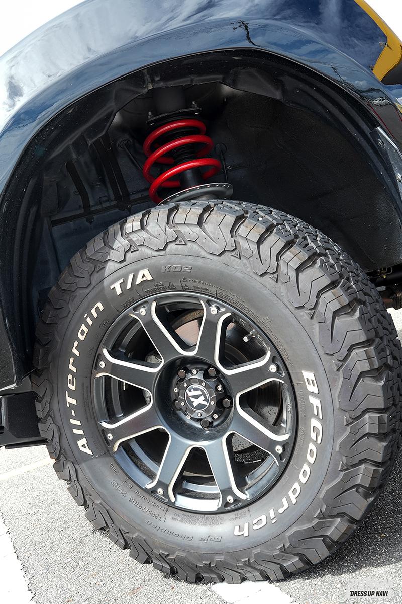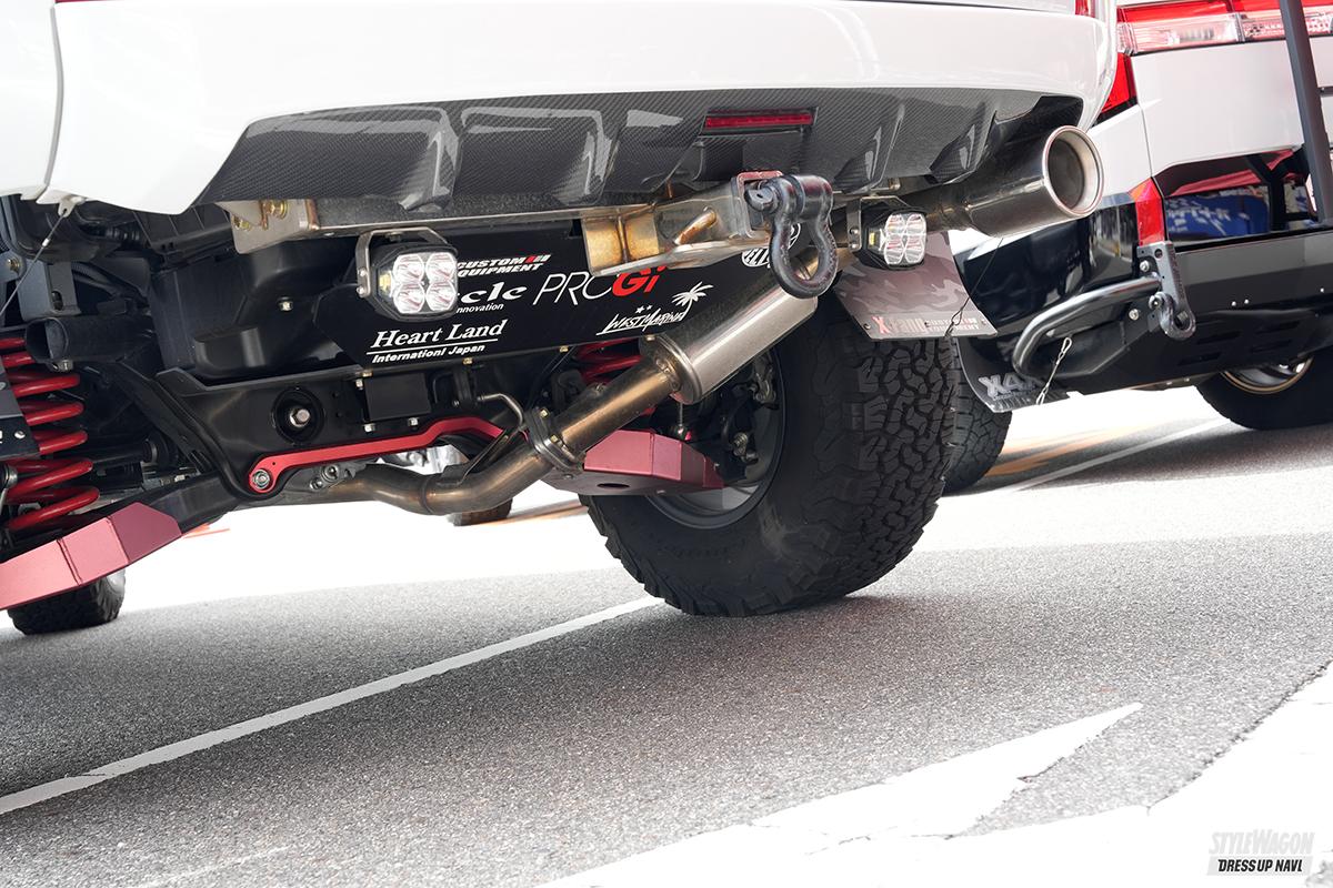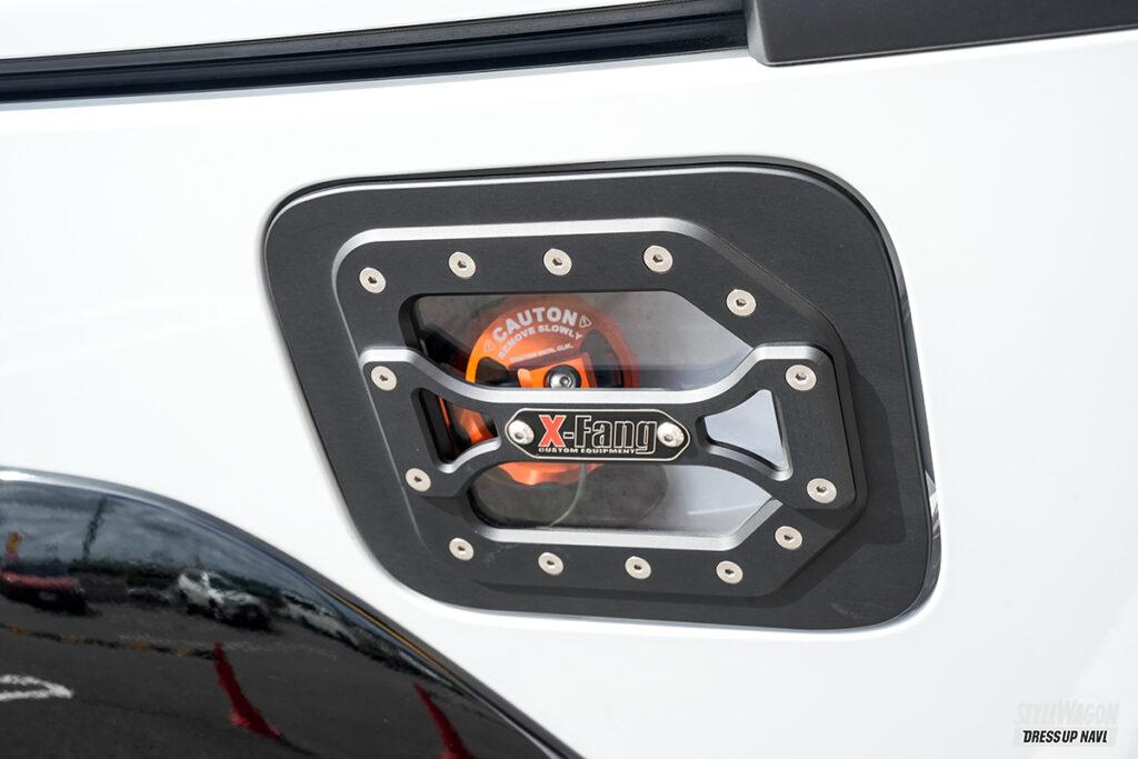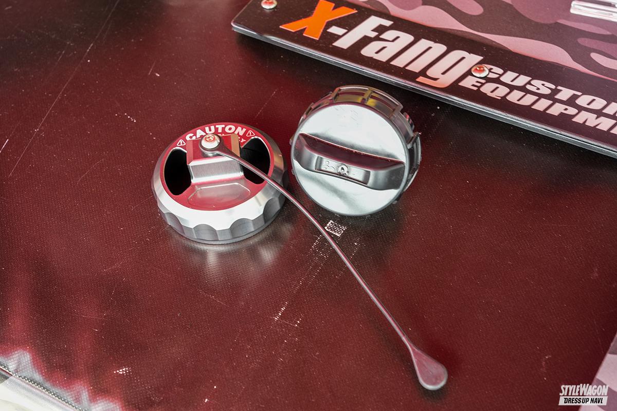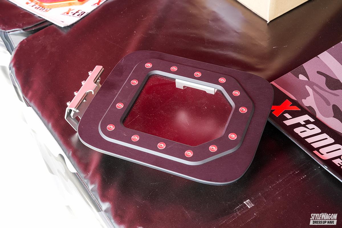 ユーザー目線でのトータルカスタマイズを展開しているクロスファング。スタイルアップはもちろんのこと、デリカの特徴でもある走破性を高めるチューニングアイテムも用意。1台まるごとクロスファングでまとめることだってできるプログラムだ。中でも大ヒットアイテムのひとつが給油口のアイテム。シースルータイプのビレットフューエルリッドと、そのシースルーが活きる最新作、ビレットフューエルキャップカバーのコンビはオフ会参加車にも多数装着されていた。質感高い高品質アルマイト仕上げでアピール度はもちろん、給油時にいつも触れる部分なので装着満足度が非常に高い!