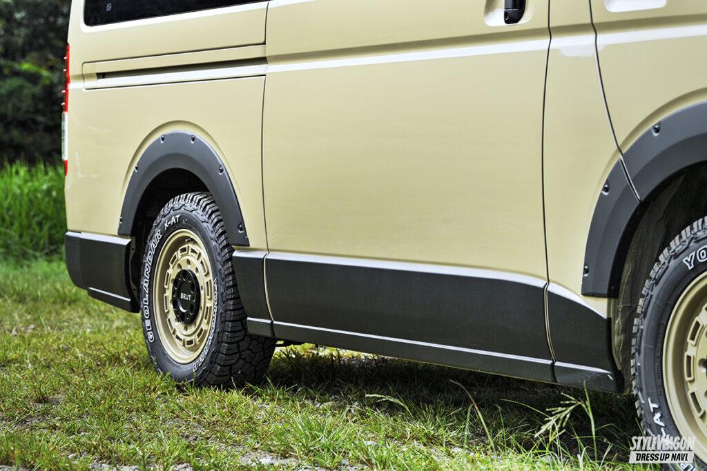 そんなモノボックスのアイデンティティはなんと言っても〝丸目ヘッドライト〟。これはカバーではなくオリジナルのユニットに交換して表現している。なんとも愛らしく、いつまでも見飽きないレトロ風の表情をハイエースに与えてくれる。この丸目ヘッドライトとウッディな内装架装、そしてタイヤ&ホイールの交換が新車コンプリート販売の基本的なメニューとなる。