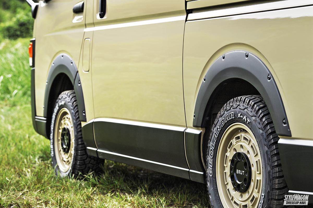 そんなモノボックスのアイデンティティはなんと言っても〝丸目ヘッドライト〟。これはカバーではなくオリジナルのユニットに交換して表現している。なんとも愛らしく、いつまでも見飽きないレトロ風の表情をハイエースに与えてくれる。この丸目ヘッドライトとウッディな内装架装、そしてタイヤ&ホイールの交換が新車コンプリート販売の基本的なメニューとなる。