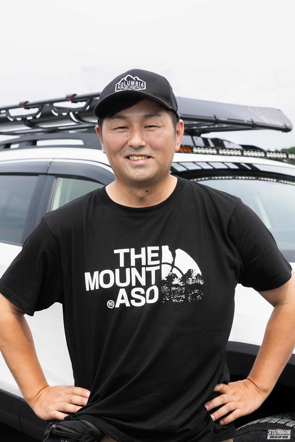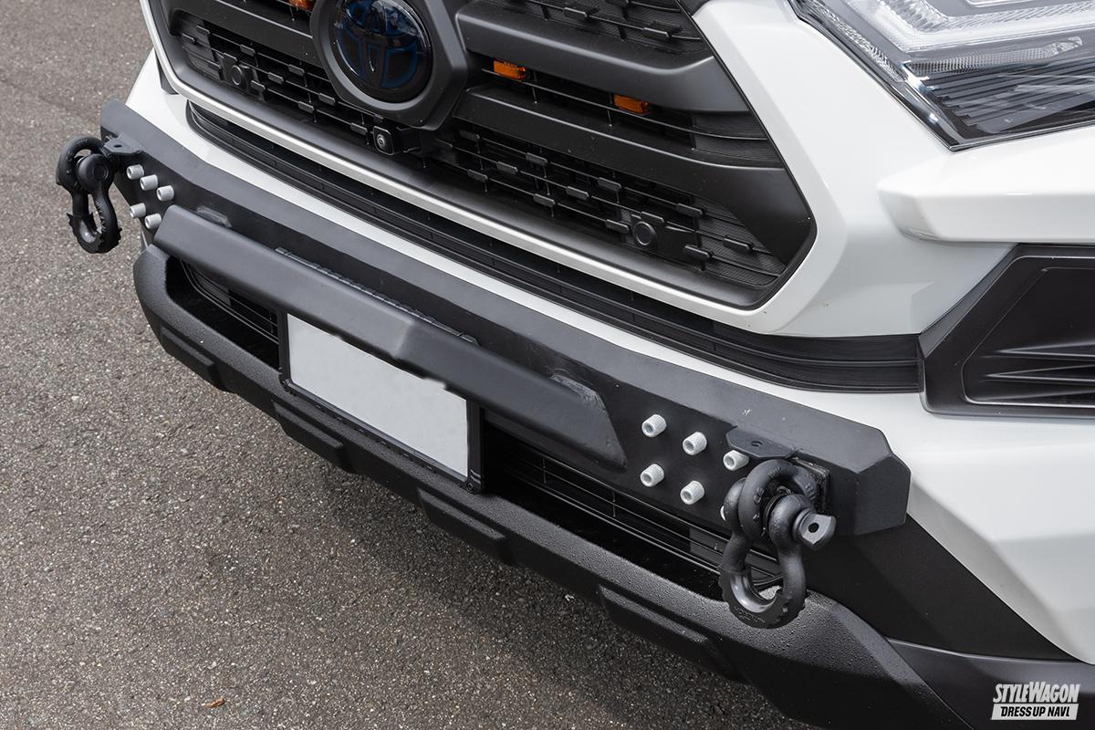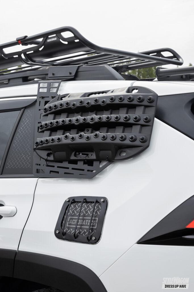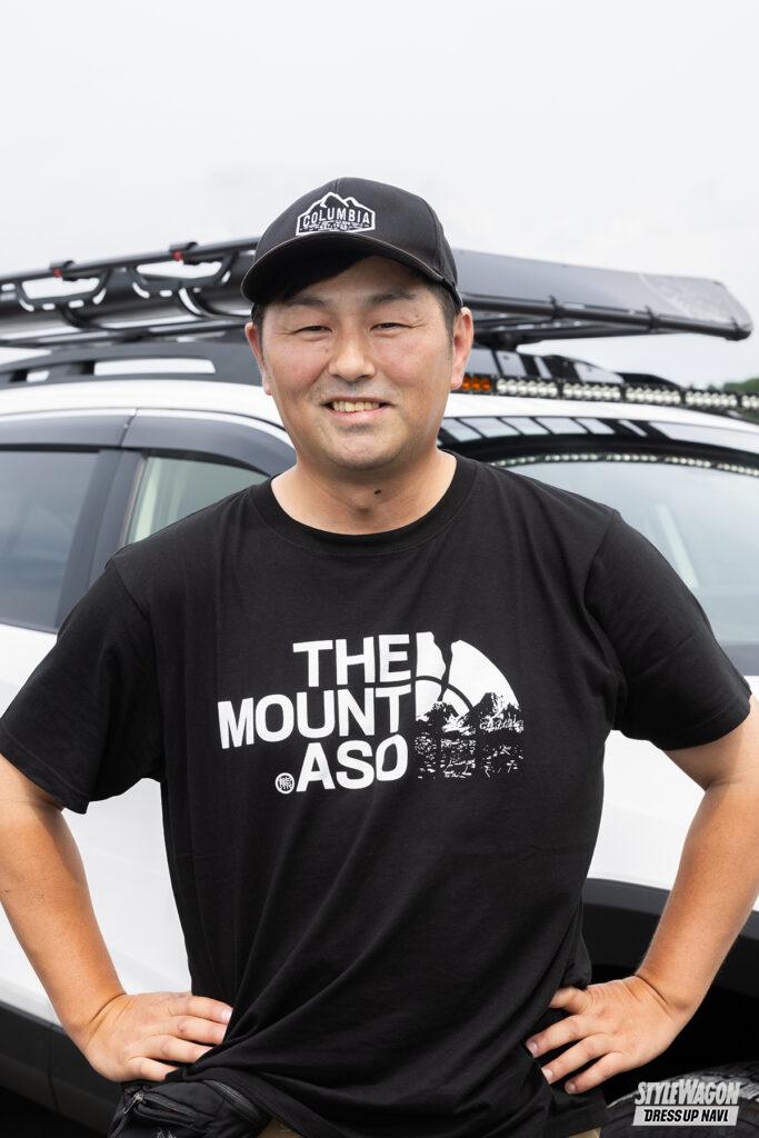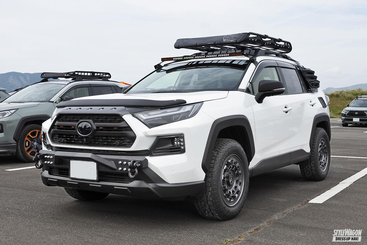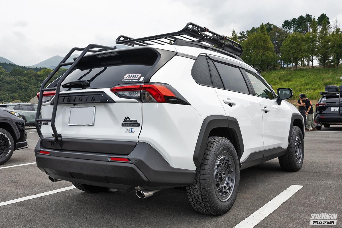 鳥取から12時間かけて参加したラスクさん。アピールポイントは自作DIYのフロントガードバー。溶接や曲げ加工など見事な仕上がりで、「どこのメーカー品?」と尋ねる参加者の姿も。今後はリア用も製作予定とのこと。その他の変更点はブラックライノのホイールやネクサスジャパンのグリル、ヤキマのオフグリッドMルーフラックなど。車高はタナベのアップサス210で約40㎜リフトアップ。