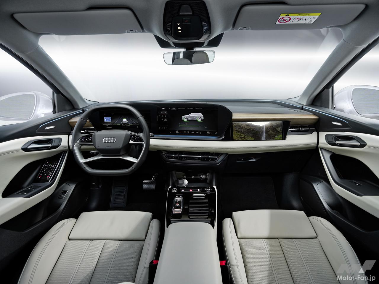 ソフトラップと呼ばれるトリムで構成されたインテリアのハイライトは、アウディMMIパノラマディスプレイとMMI助手席ディスプレイを組み合わせた「デジタルステージ」だ。明確にグループ化されたこれらのディスプレイは、インテリアのデザインコンセプトに完全に統合されており、明るく広々とした雰囲気を醸し出している。スリムな独立型アウディMMIパノラマディスプレイは、曲面デザインとOLED(有機LED)テクノロジーを特徴とし、11.9インチのアウディバーチャルコックピットと14.5インチMMIタッチディスプレイで構成されている。ドライバーの手の届く範囲はアーチ状に設計されており、曲面形状のディスプレイを採用。この曲面ディスプレイの形状は、エクステリアデザインの特徴となっているシングルフレームを想起させるものだ。特別なアンビエントライトの採用によって、夜間は曲面ディスプレイが宙に浮いているように見える。