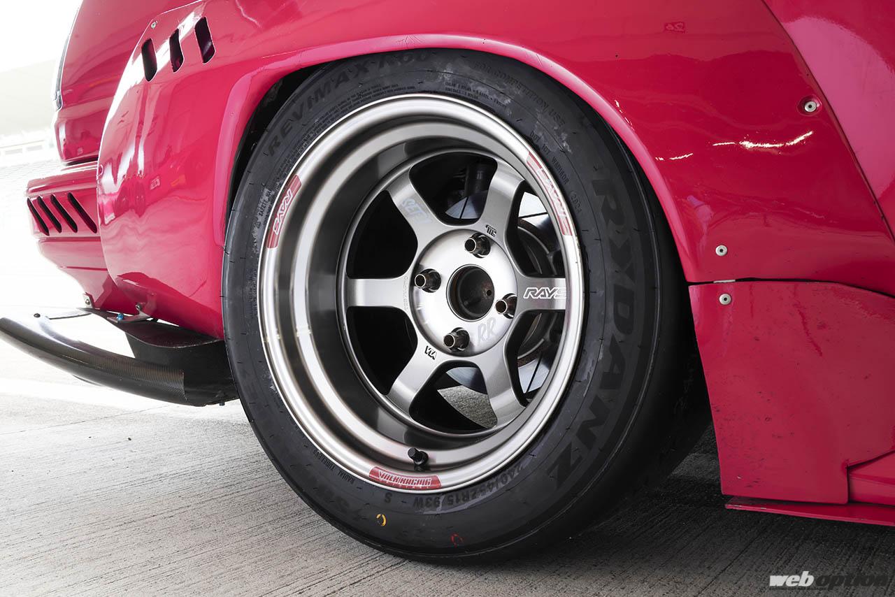 今回のテストでその差異は体感とタイムにはっきりと表れた。速さを極めたいなら、今あるホイールのなかでTE37V-PROはベストな選択であるとコータローさんは絶賛。PROのサブネームは伊達ではない。現在は15インチのみの設定だが、16・17・18インチも追加予定。ビジュアルと性能を満たす新たな旧車用ホイールとしてはもはや他の追従を許さないだろう。