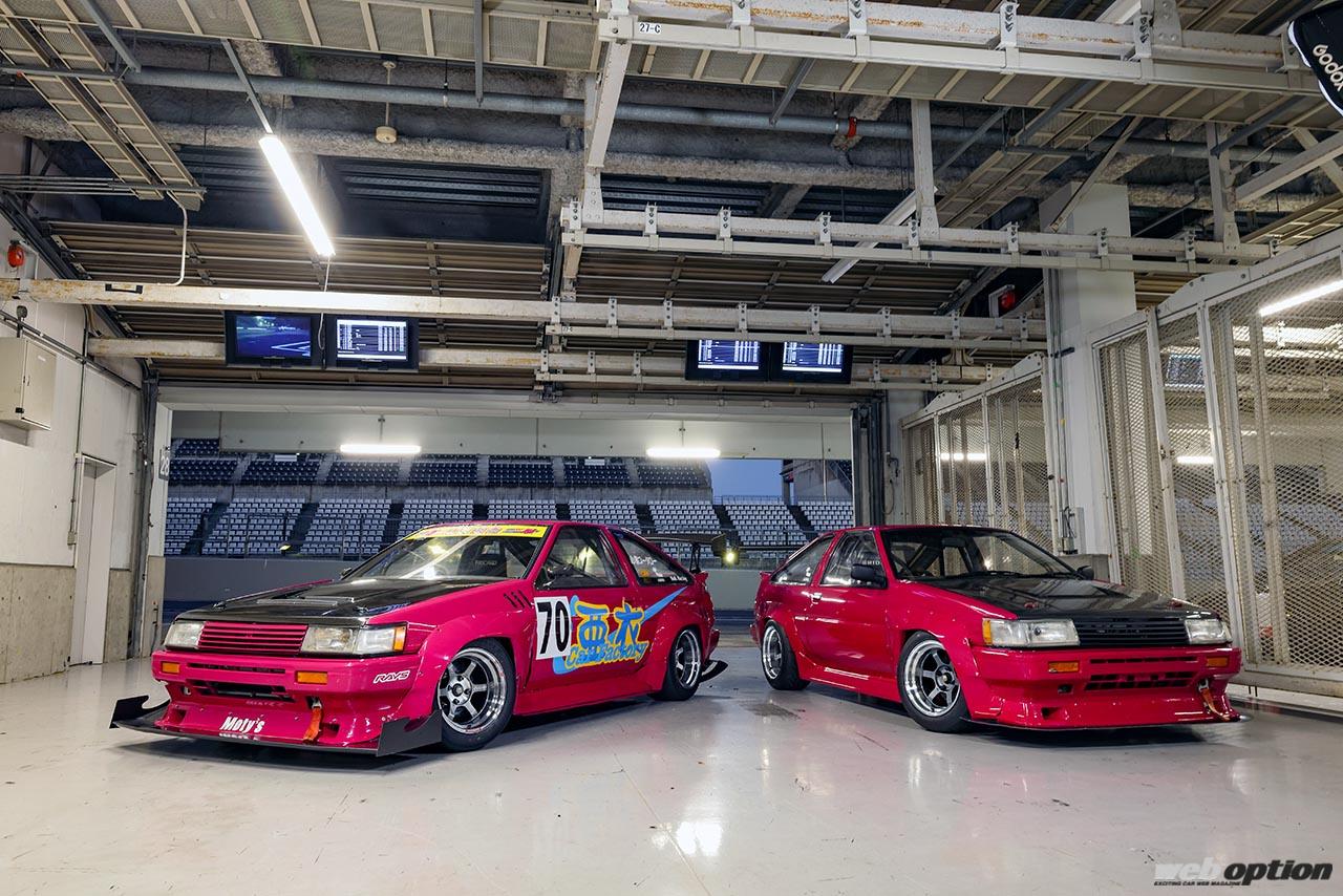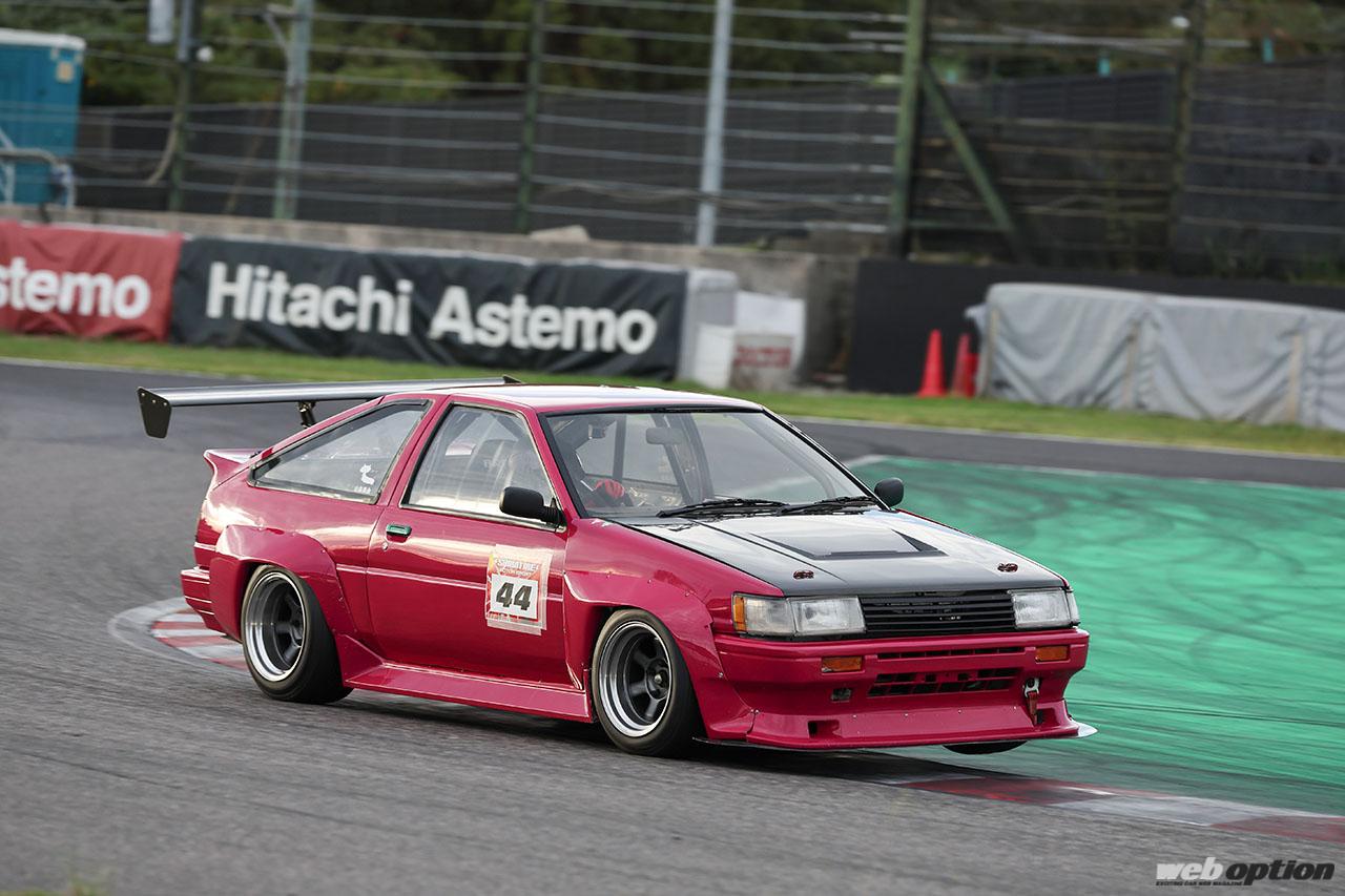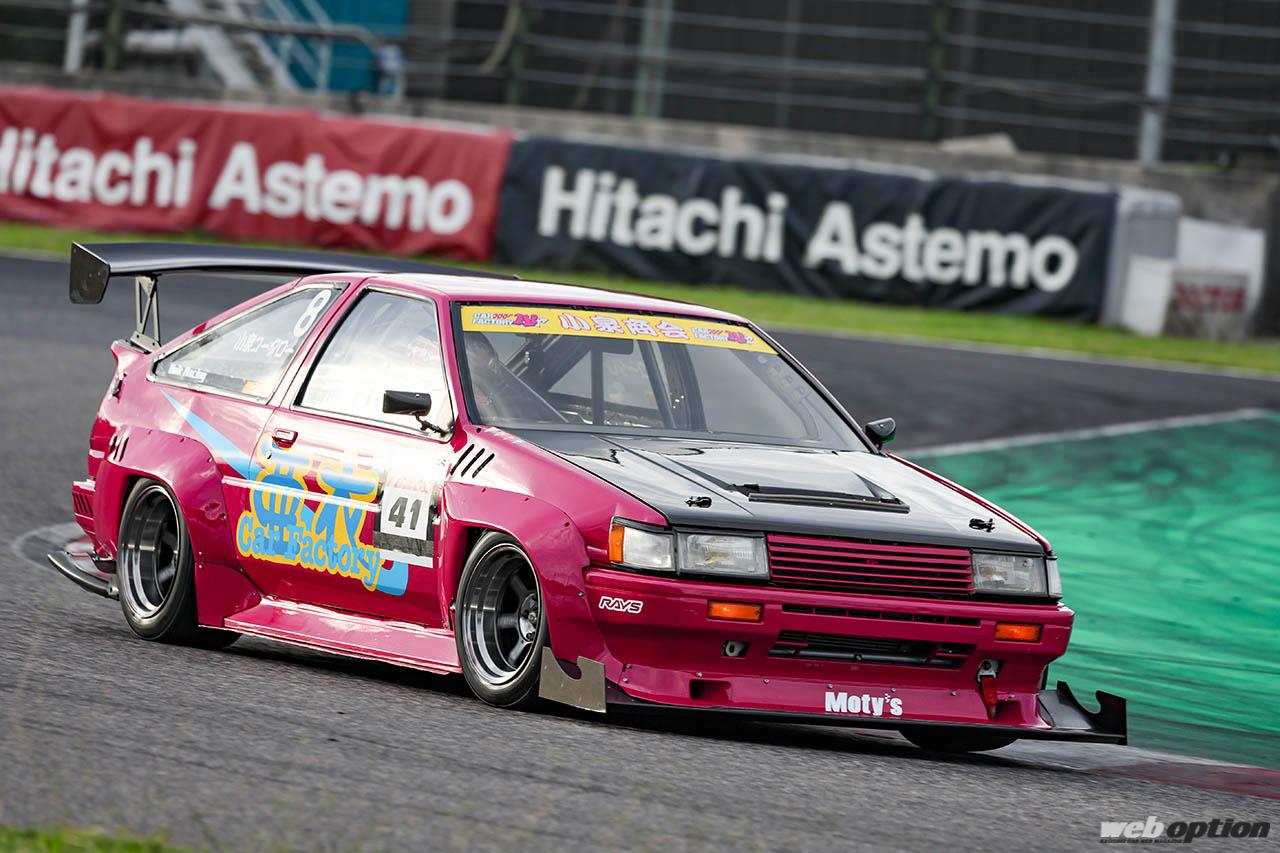 今回は、鈴鹿サーキットで行われたTE37V-PRO最終テストの独占取材が実現。AE86の業界では指折りの有力ショップのひとつである“小泉商会”のデモカーにシバタイヤのスリックタイヤを組み合わせている。1850㏄まで排気量アップされた7A-Gエンジンは250psを発揮し、自然吸気のAE86チューンドとしてアガリと言うべきハイチューンスペック。ボディ補強も徹底されており、コーナーリング時のホイールに対する負担は相当なものだ。テストは従来のTE37Vと組み替えながらの比較する形で行われた。