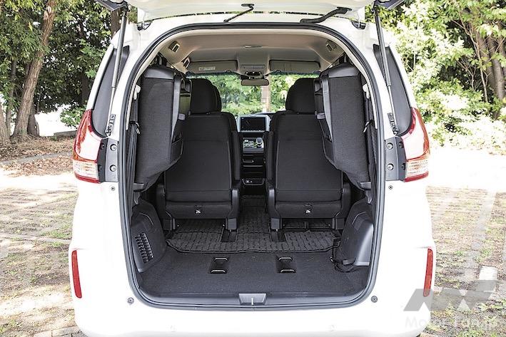 3列目席は空間も座り心地もライバルを上回る。一方で、折り畳みは左右に跳ね上げる方式なので、畳んだ際にはラゲッジを侵食する。3列目席の使用頻度が高い人向けと言えるだろう。加えてバリエーションモデルとして、専用サスと空力パーツを装備した「モデューロX」と、SUV風の加飾を加えた「クロスター」を用意。特別仕様車「ブラックスタイル」も加えると、30種類の選択肢となる。