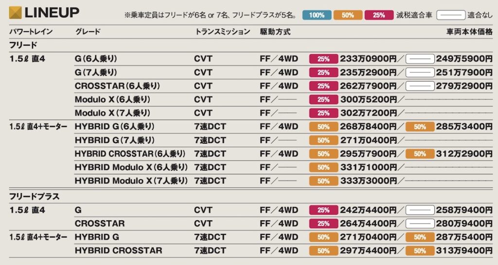 まずシートの仕様だけで3種類。3列シート車には、2列目キャプテンシートの6人乗りと、ベンチシートの7人乗りが用意される。加えて〝フリードプラス〞は、サードシートレスの5人乗りとなる。2列目シートの格納方法がそれぞれ異なるのも特徴。キャプテンシート仕様は、ラゲッジ容量より座り心地を重視しており、前後にスライドできるだけ。