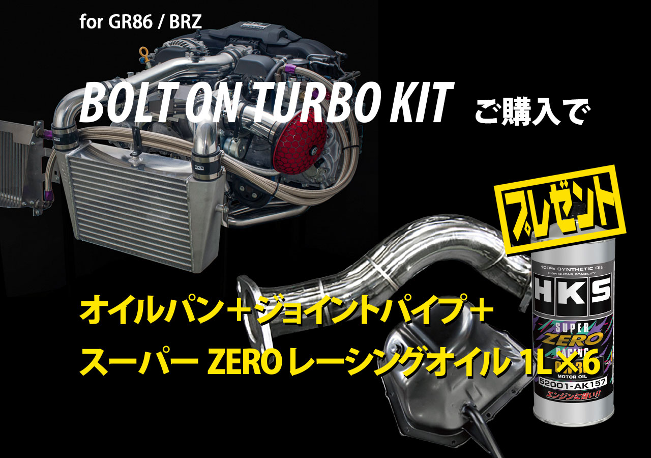 GR86&BRZ用ボルトオンターボキット(90万2000円)と購入すると、オイルパン(4万4000円)&ジョイントパイプ(3万8500円)&スーパーZEROレーシングオイル6L分のセットがプレゼントされる。