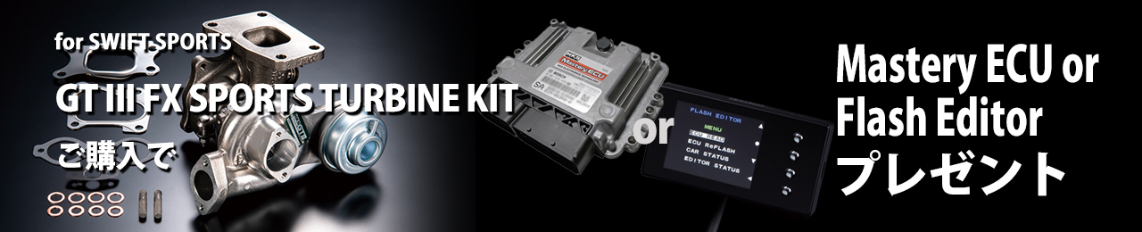 ZC33S用GTIII-FXタービンキット(22万円)を購入すると、マスタリーECU(13万2000円)もしくはフラッシュエディター(11万円)がプレゼントされる。