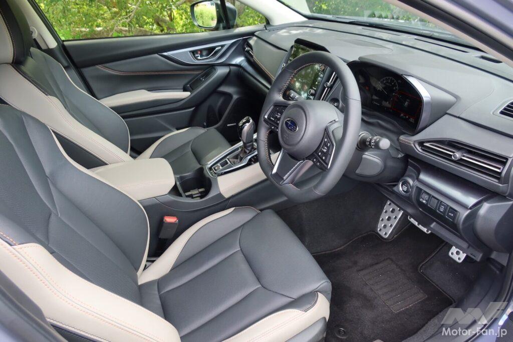 インテリアも土の香りがしないよう、「上質さ」をコンセプトにまとめられている。シートはブラックとアッシュカラーのツートンとし、カッパーステッチのアクセントを入れている。シートはフロアが高くなったSUV化に合わせて乗降性に配慮しながらもホールド性を確保すべく、座面の土手高さを最適化した。広い荷室空間はレヴォーグ譲りだ(寸法・容量は同一)。