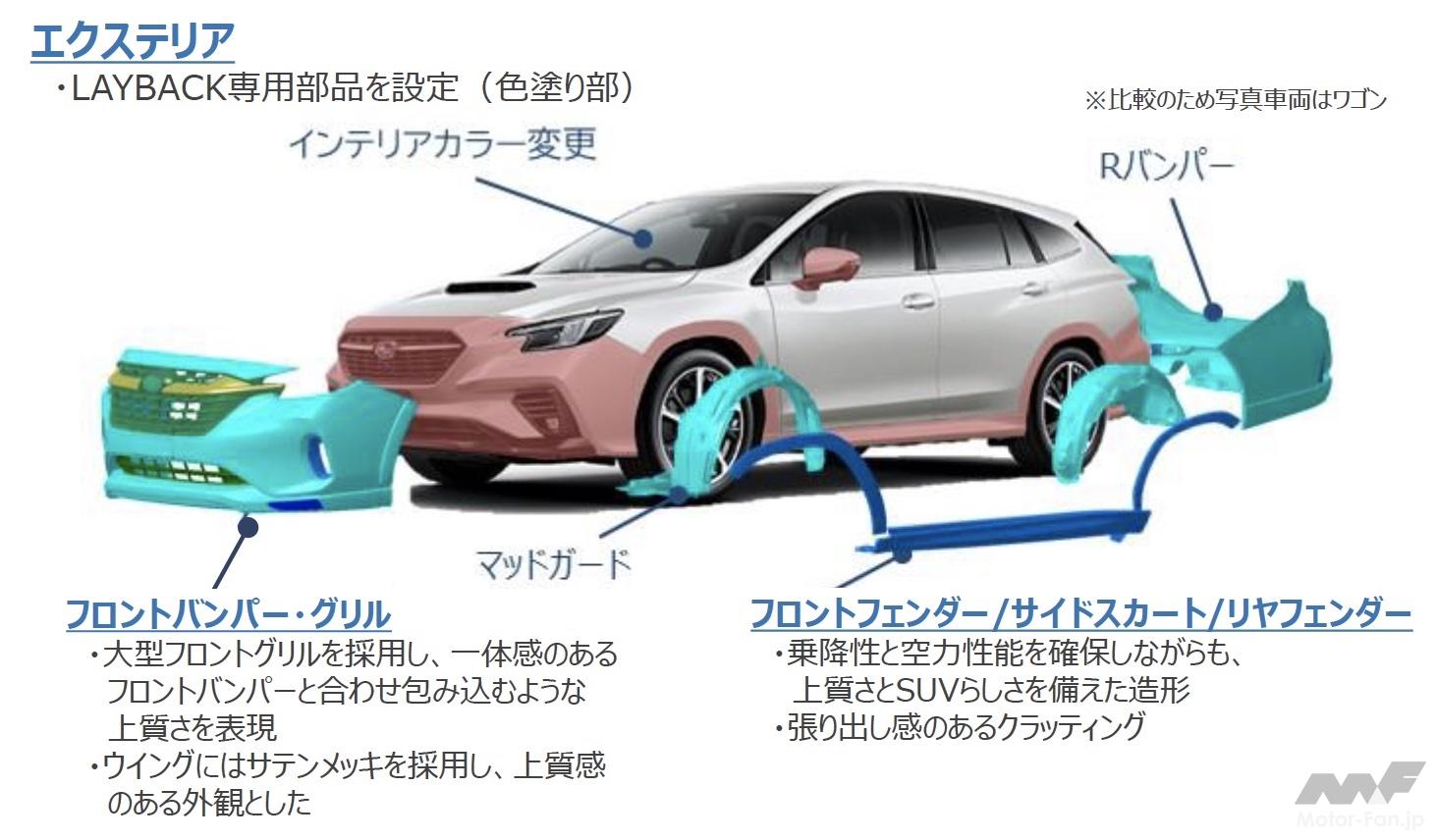 スバルにはインプレッサから派生したクロストレックやフォレスター、レガシィから派生したレガシィ・アウトバックがある。レイバックもその系譜に連なるSUVかというと、スバルはこれを明確に否定する。クロストレックやフォレスター、アウトバックがオフロード寄りの商品であるのに対し、レイバックは「都市型SUV」を標榜する。開発責任者の小林正明氏は「SUVだが、土の香りがしないことを意識した」と説明する。