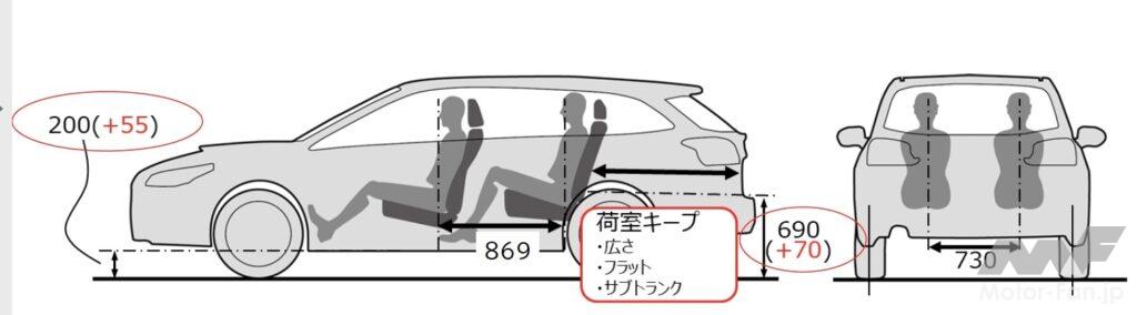 全幅の拡大分は前後のホイールアーチに施したクラッディング(樹脂製の縁取り)の影響。全高はSUVを名乗るにふさわしい程度に最低地上高を上げた影響だ。最低地上高は200mm(レヴォーグ比+55mm)で、クロストレックと同じ。レヴォーグ(GT-H)の225/45R18対し、大径の225/55R18サイズのタイヤを装着したのに加え、サスペンションメンバーと車体の間にスペーサーを入れて車高を上げている。インプレッサをベースにクロストレックを仕立てたのと同じ手法だ。