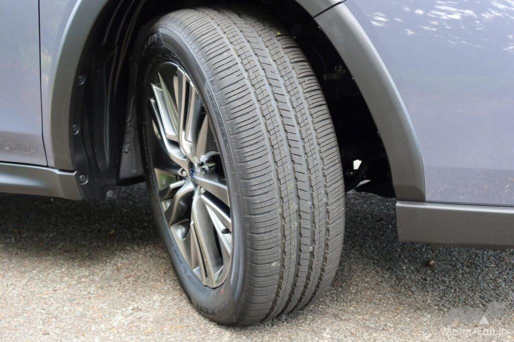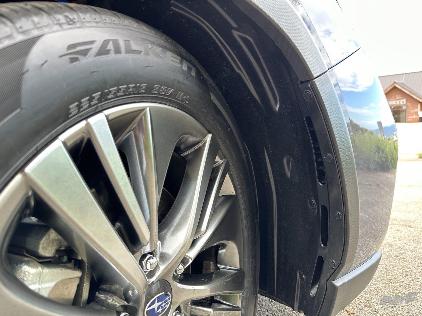 タイヤはオールシーズンタイヤ(FALKEN ZIEX ZE001A A/S)を履く。これはクロストレックが採用しているものと同じものを使う。サイズはタイヤサイズ:225/55/R18(705.2,mm)、レヴォーグはタイヤサイズ:225/45/R18(660.2mm)だから、タイヤ単体で45mm大径化している。指定空気圧はF230kPa/R220kPa