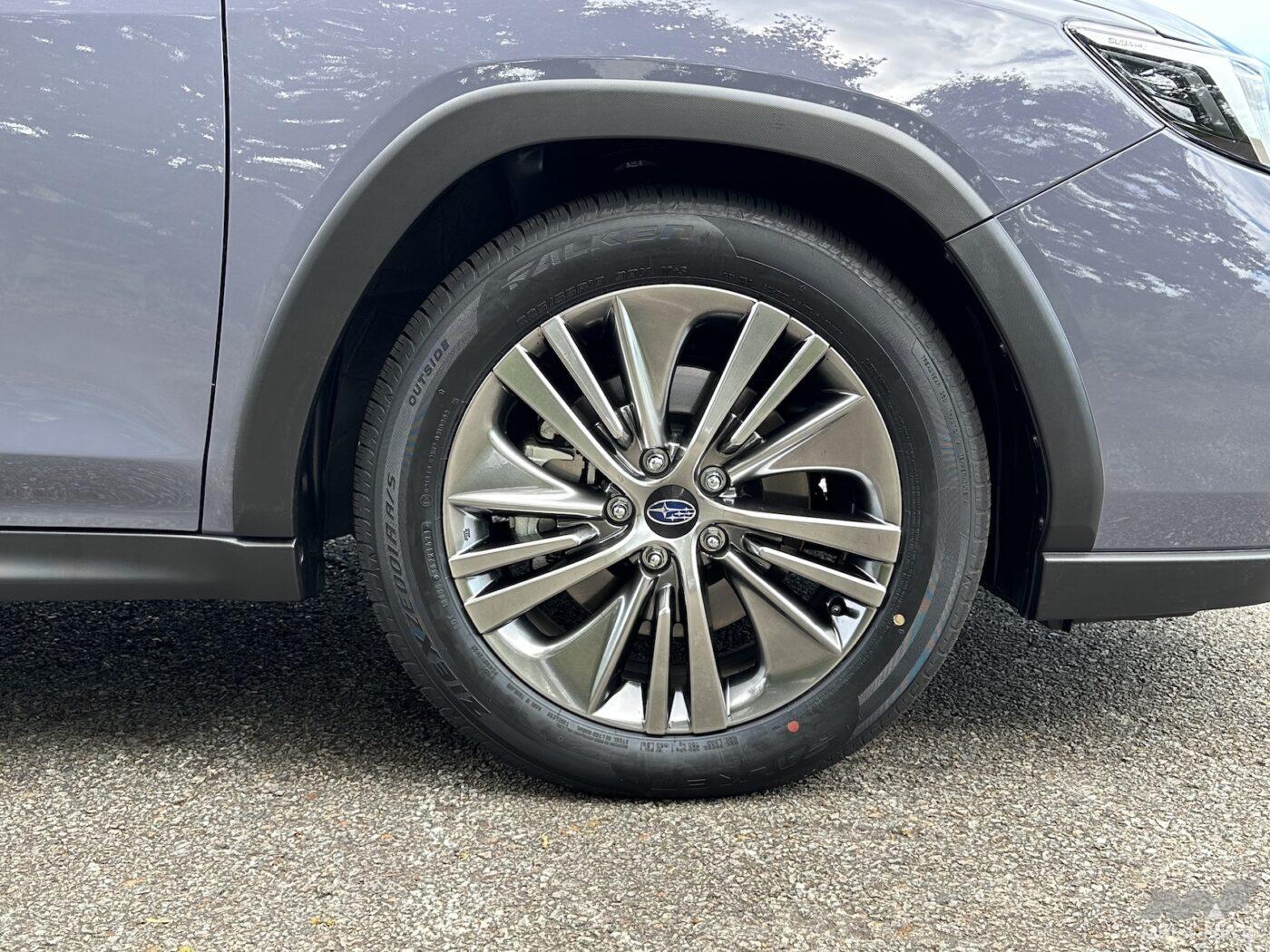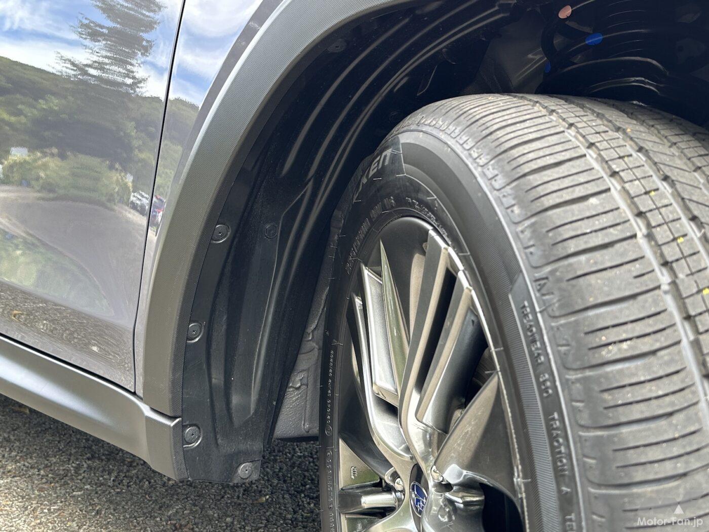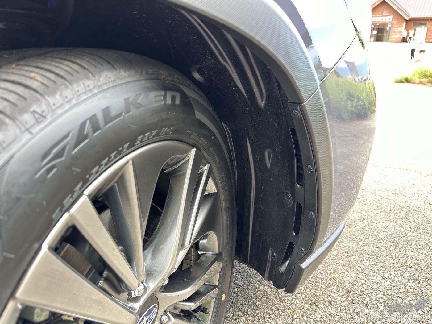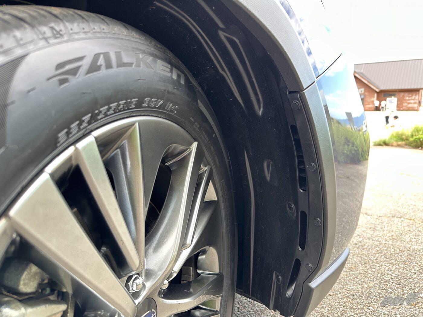 タイヤはオールシーズンタイヤ(FALKEN ZIEX ZE001A A/S)を履く。これはクロストレックが採用しているものと同じものを使う。サイズはタイヤサイズ:225/55/R18(705.2,mm)、レヴォーグはタイヤサイズ:225/45/R18(660.2mm)だから、タイヤ単体で45mm大径化している。指定空気圧はF230kPa/R220kPa