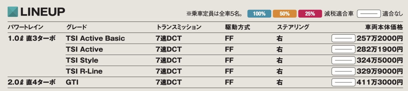 乗り味はドイツ車らしく、ガッシリとしたボディ剛性が好印象。スポーツサスを装備する「R-ライン」の硬めの脚も、不快感なくしっかり受け止める。ただし街乗りを重視するなら、65タイヤを装着する「アクティブ」がベスト。55タイヤを装着する「スタイル」は、街乗りからワインディングまでオールラウンドプレイヤーだ。「R-ライン」は脚が勝ち気味なので、レスポンスとパワーに不満を覚えるかもしれない。とはいえ「GTI」は、一般ユーザーには〝やり過ぎ感〞がある。