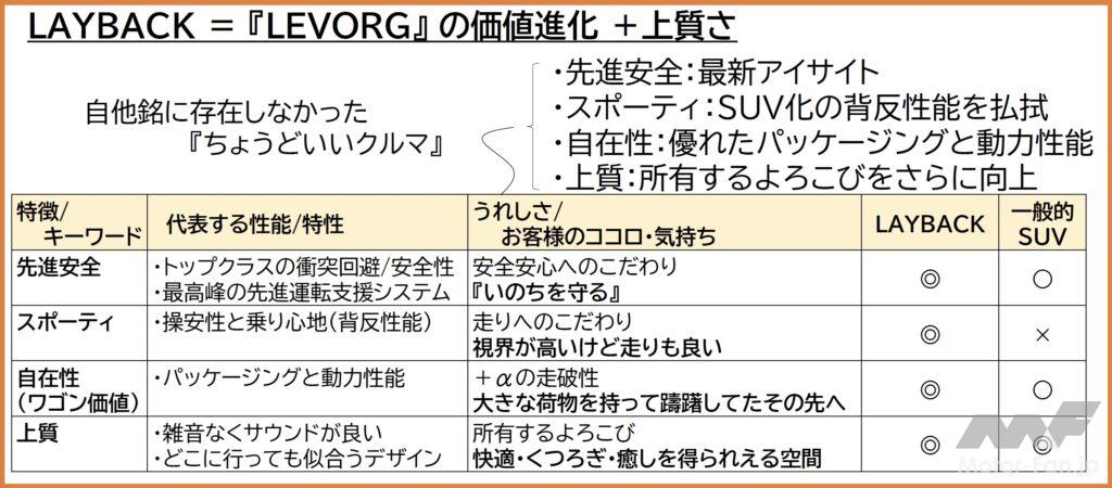 レヴォーグが持っている「スポーティ」「先進安全」に「自在性」「上質さ」をプラスしたモデルがレイバックだという。