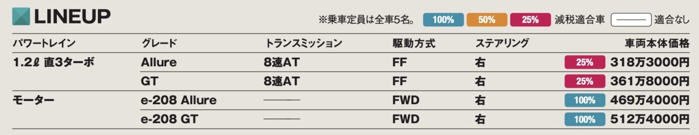 208は日本におけるプジョー最小モデルとなるコンパクトハッチバック。最近はクロスオーバーモデルとなる兄貴分の2008の方が人気だが、やはり走りの楽しさや扱いやすさでは208の方が上を行く。2008同様に1.2ℓ直噴ターボのほかに、ピュアEVが用意されているのも特徴だ。