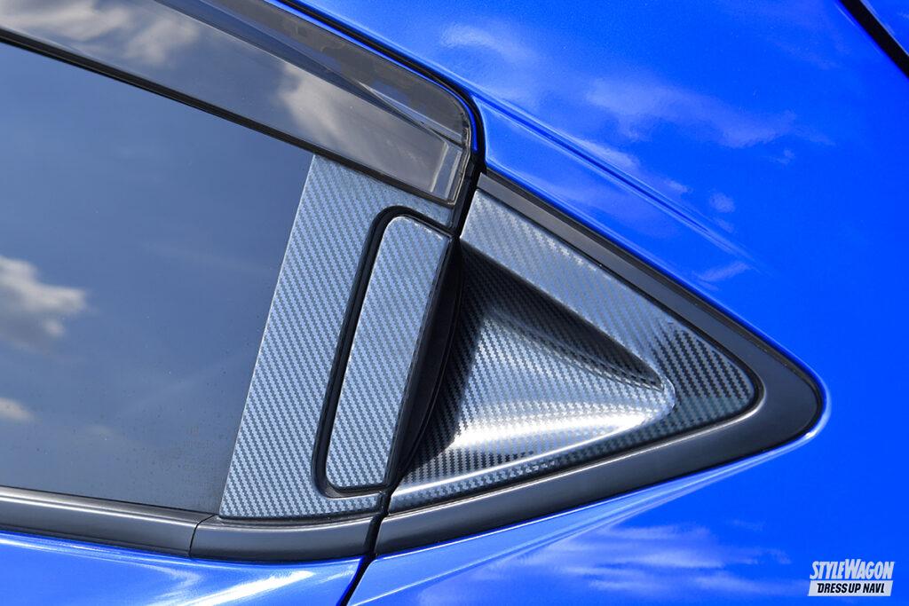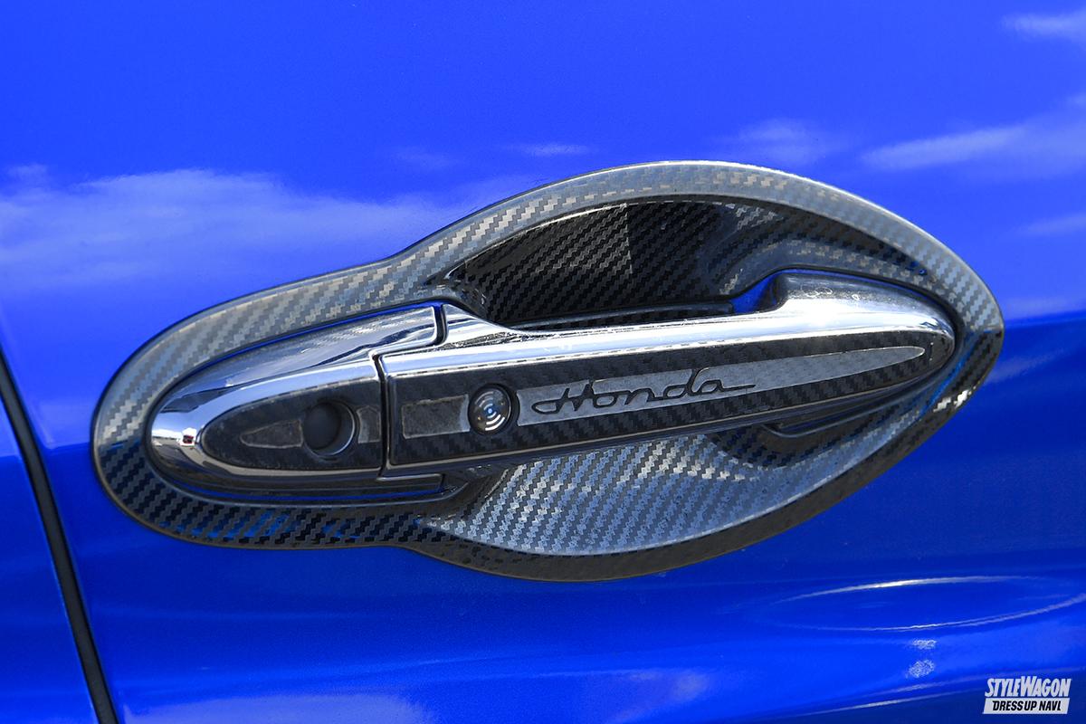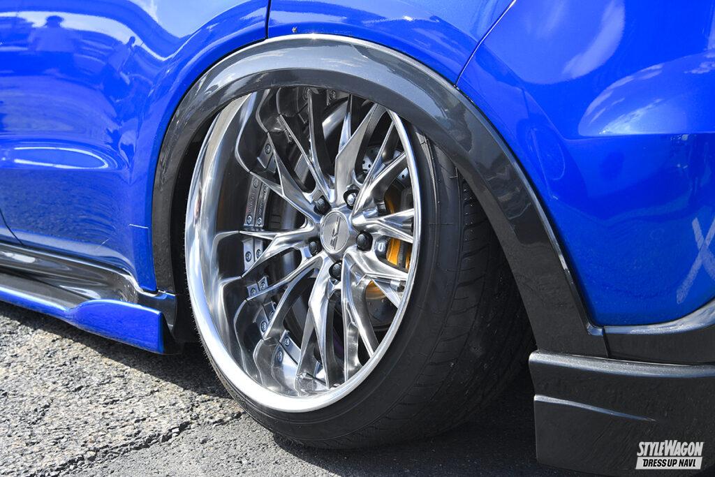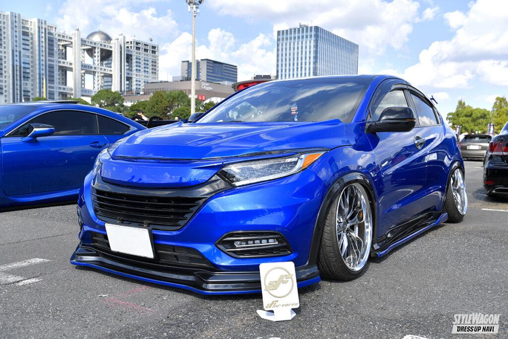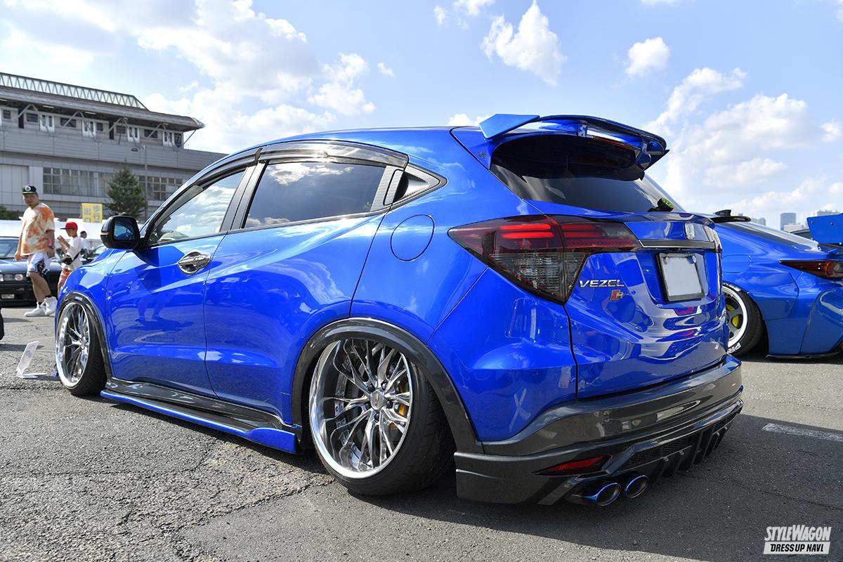 現在のヴェゼルに乗り換えてから約5年だが、ヴェゼル歴は10年を超えるという長塚さん。以前はハイブリッドのRU系ヴェゼルに乗り、足は車高調。ターボ車への乗り換えを機会に導入したのがエアフォースのエアサスで、大胆にリム被りする衝撃的なロースタイルは、リアアクスルやロアアームの交換によって実現している。またターボ車=スポーツ系というイメージから、GTウイングやカーボン仕様のアクセサリーなど“速そう”なアイテムを上手くコーディネイトしている。