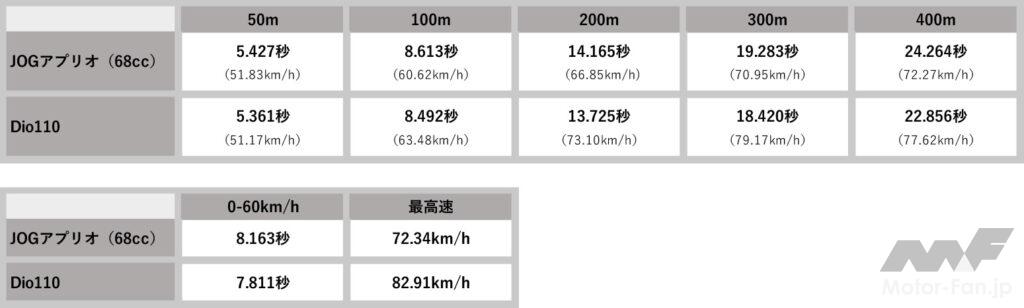50m、100m、200m、300m、400mのすべてのセクションにおいて、Dio110の到達タイムの勝ち。