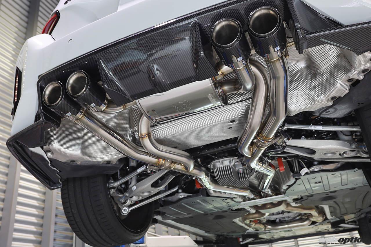 装着車両の存在感を高めるフィニッシュに関しても抜かりは一切なし。リヤの躍動感を盛り上げるカーボンリヤディフューザーと相性抜群なカーボンテールを105φデュアルで左右に備え、精悍なM2のリヤビューをさらなる高みに引き上げている。