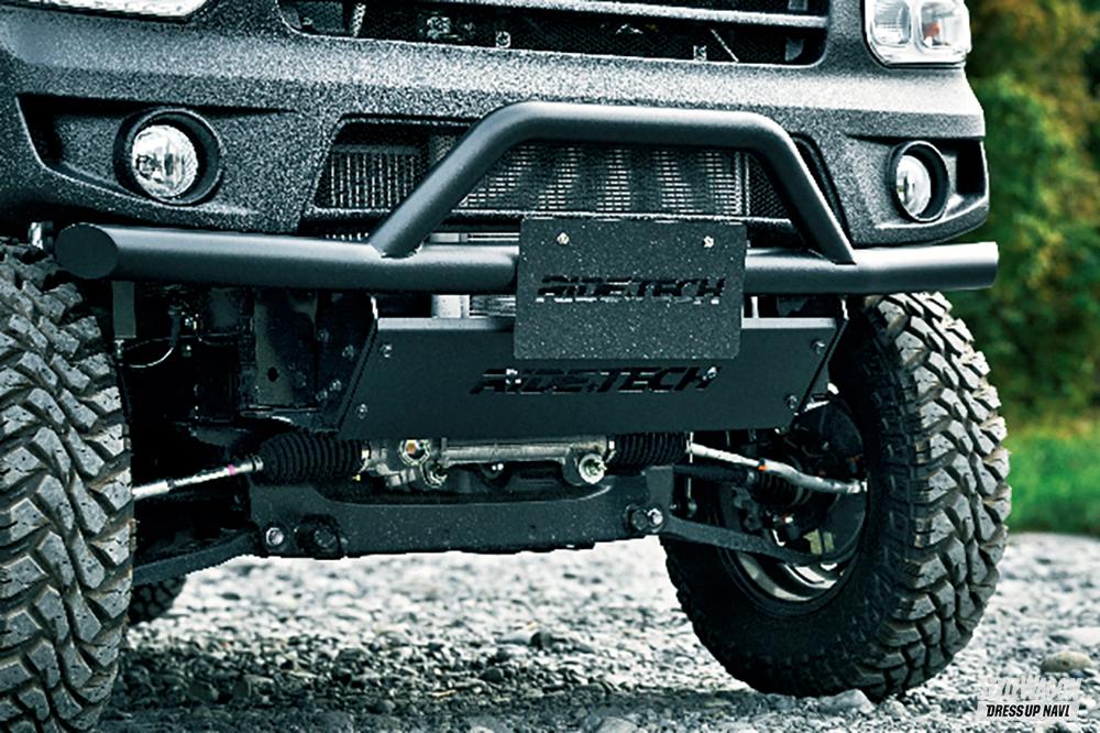 エブリイはフロントバンパーをショート化するとコンデンサーの下半分などが丸見えになってしまうが、それを隠してなおかつワイルドに見せるアイテムも用意している。ライドテックのロゴがくり抜かれたスキッドプレートがセットになったガードバーは、パイプがストレート形状のタイプ1とセンターにアーチを追加して凸型にデザインしたタイプ2をラインアップ。もう少しシンプルに決めたいなら、FRP製のスキッドプレートがオススメ。他にはロゴが型押しされた高級感あふれるシートカバー、フロアカーペットの汚れを防ぐ3D形状のフロアマットといった内装アイテムも用意。エブリイの内外装をライドテックのパーツでトータルコーディネイトできる。