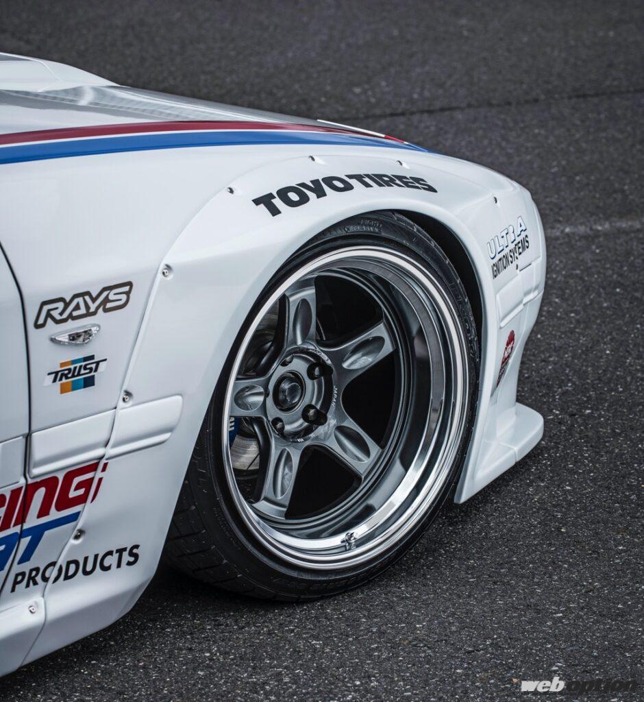 パンデムのワイドボディを纏ったレーシースタイルのFC3Sに、ディンプルスポークがドンピシャとなる21Cは、フロント10.5Jマイナス25×18インチ、リヤ11.5Jマイナス40×18インチでマッチング。引っ張りタイヤ&エアサスで、フロント95mmのLLリム、リヤ108mmのLLLリムを収める。