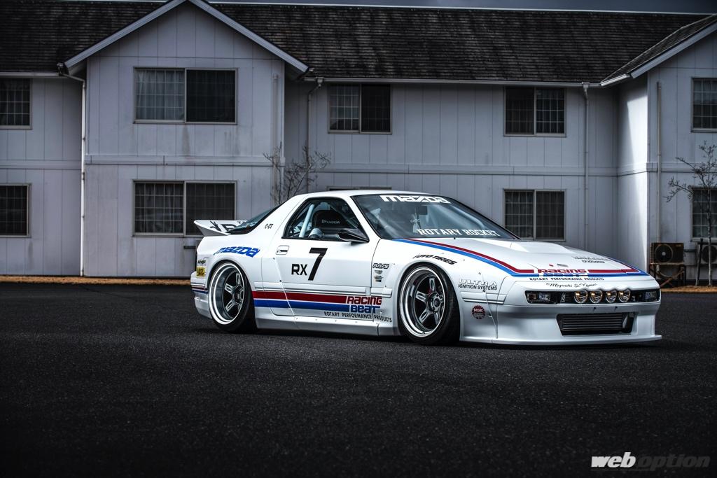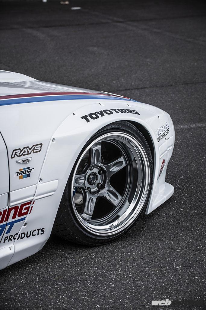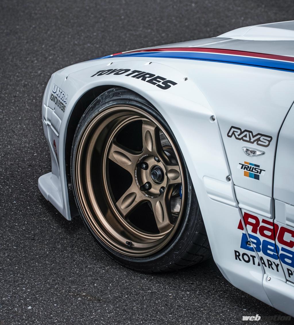 パンデムのワイドボディを纏ったレーシースタイルのFC3Sに、ディンプルスポークがドンピシャとなる21Cは、フロント10.5Jマイナス25×18インチ、リヤ11.5Jマイナス40×18インチでマッチング。引っ張りタイヤ&エアサスで、フロント95mmのLLリム、リヤ108mmのLLLリムを収める。