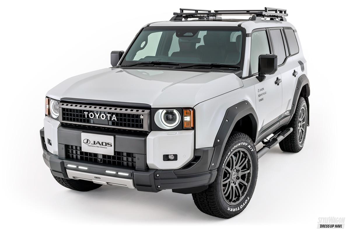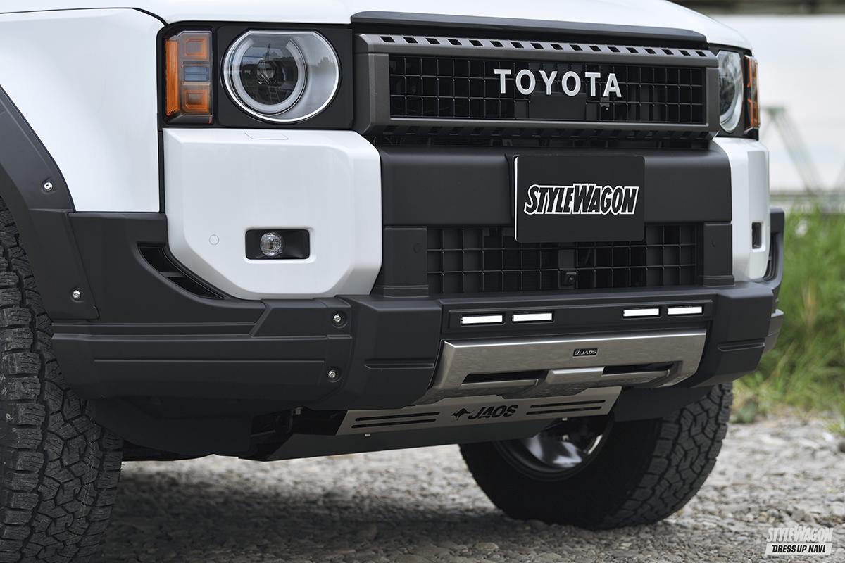 このページにある2台のランクル250は、ノーマル車と、ジャオスという名門カスタムメーカーが手掛けたデモカー。ジャオスデモカーの方は、フロントバンパーの下のデザインが変わってLEDが追加されていたり、ボディサイドもステップのデザインが異なっています。タイヤはよりゴツくなり、ホイールはスタイリッシュに、さらにルーフにも何やらギアが付いている。比べてみるとその違いは一目瞭然で、よりアウトドアシーンに似合いそうなお洒落な感じがしますよね。これがカスタムの効果です。どんなスタイルにしたいかによって、選ぶパーツも変わってきます。基本的にはファッションを楽しむのと全く同じ感覚と思ってもらえればOKです。次ページではランクルのカスタムにお薦めのパーツを紹介していきましょう。