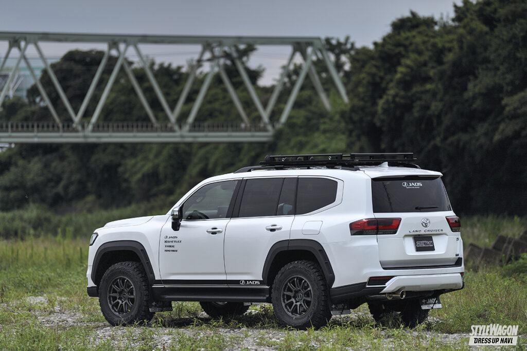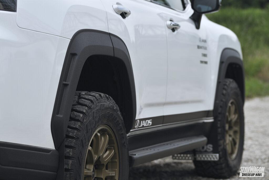 ヨンク系カスタムの名門、ジャオス。優れたデザインはもちろん、デザートレースの元祖と言われる「バハ1000」やアジアクロスカントリーラリー参戦のノウハウを市販品開発にフィードバックするなど、信頼性にも定評があるブランドだ。そのジャオスが手掛けるランクル300は、ランクルのフラッグシップらしく派手さは控えつつ、しかし圧倒的な存在感をアピールするボディパーツを揃える。写真のZXグレード向けは、特徴的な純正フロントグリルには触れず、バンパーに被せることでLEDを追加できるフロントバンパーガードやワンポイントながらスポーティなリヤスパッツで重厚さをアピール。注目は左右で50ミリのワイド化を図るオーバーフェンダー タイプS。力強い印象を与えるとともに、後部ダクトがスポーティさも演出。手数は少なくとも十分に“人とは違う”をアピールできる。