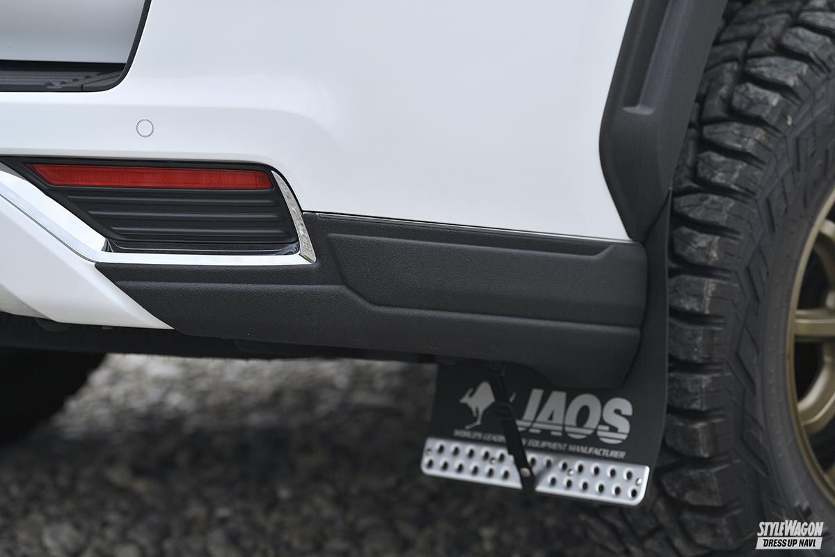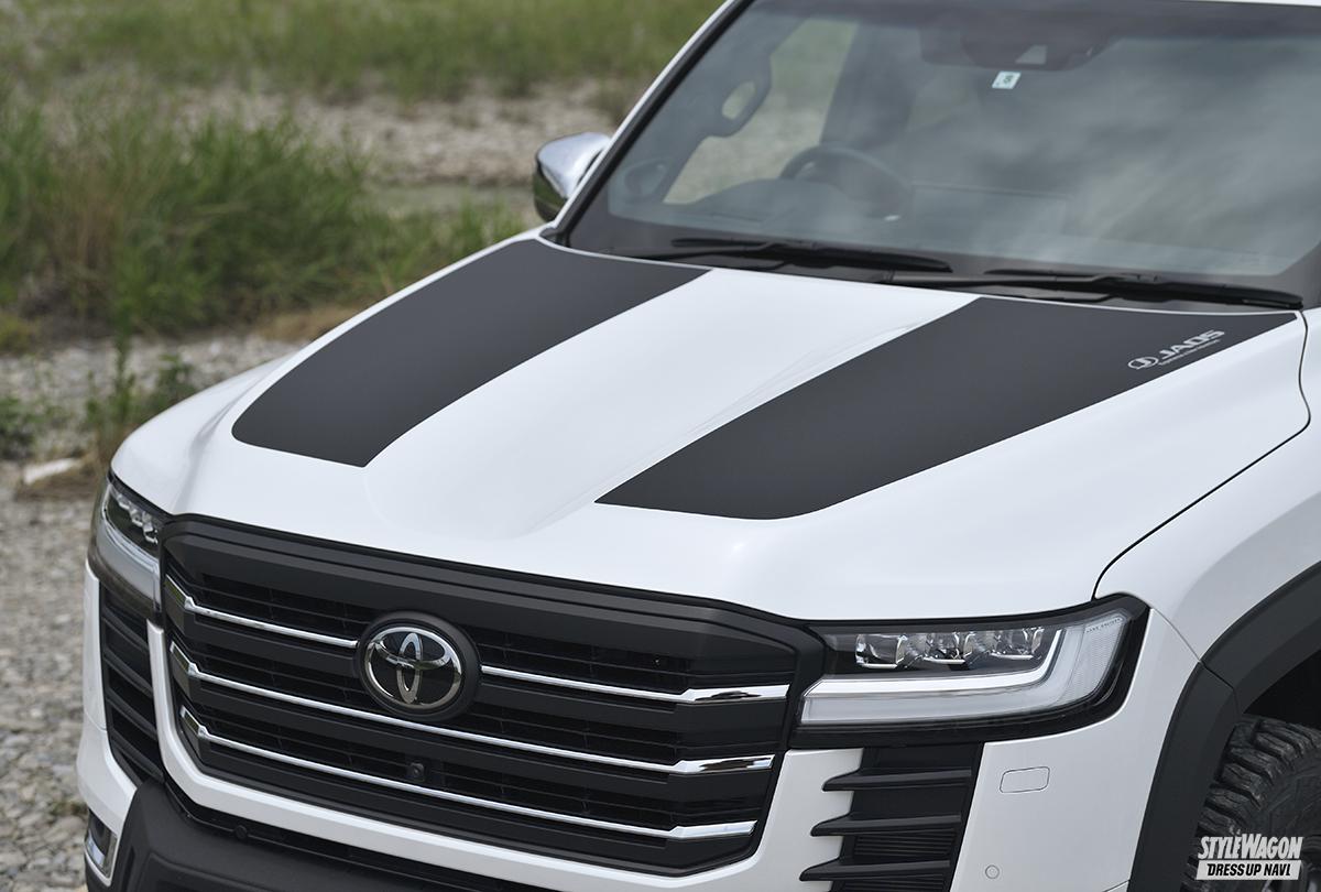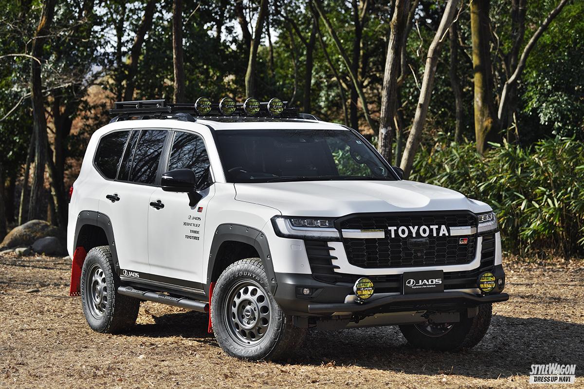 ヨンク系カスタムの名門、ジャオス。優れたデザインはもちろん、デザートレースの元祖と言われる「バハ1000」やアジアクロスカントリーラリー参戦のノウハウを市販品開発にフィードバックするなど、信頼性にも定評があるブランドだ。そのジャオスが手掛けるランクル300は、ランクルのフラッグシップらしく派手さは控えつつ、しかし圧倒的な存在感をアピールするボディパーツを揃える。写真のZXグレード向けは、特徴的な純正フロントグリルには触れず、バンパーに被せることでLEDを追加できるフロントバンパーガードやワンポイントながらスポーティなリヤスパッツで重厚さをアピール。注目は左右で50ミリのワイド化を図るオーバーフェンダー タイプS。力強い印象を与えるとともに、後部ダクトがスポーティさも演出。手数は少なくとも十分に“人とは違う”をアピールできる。