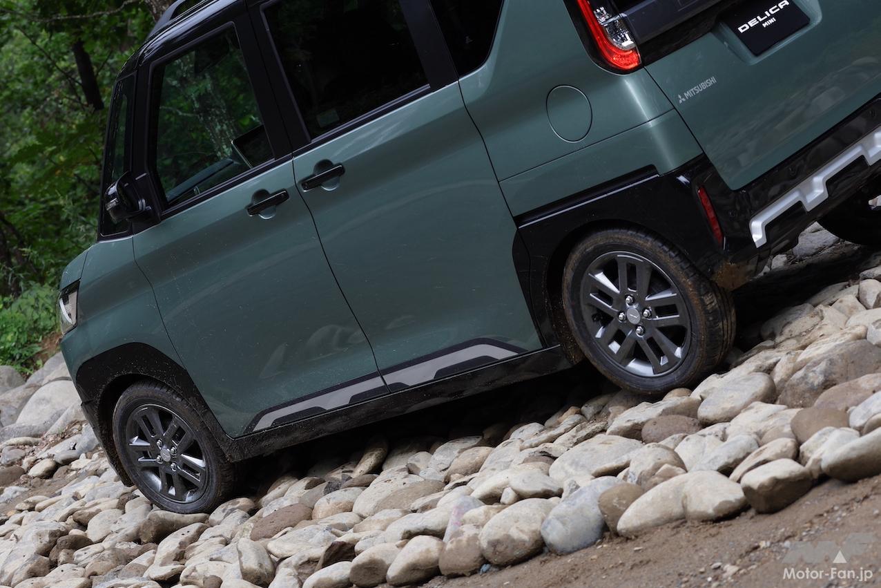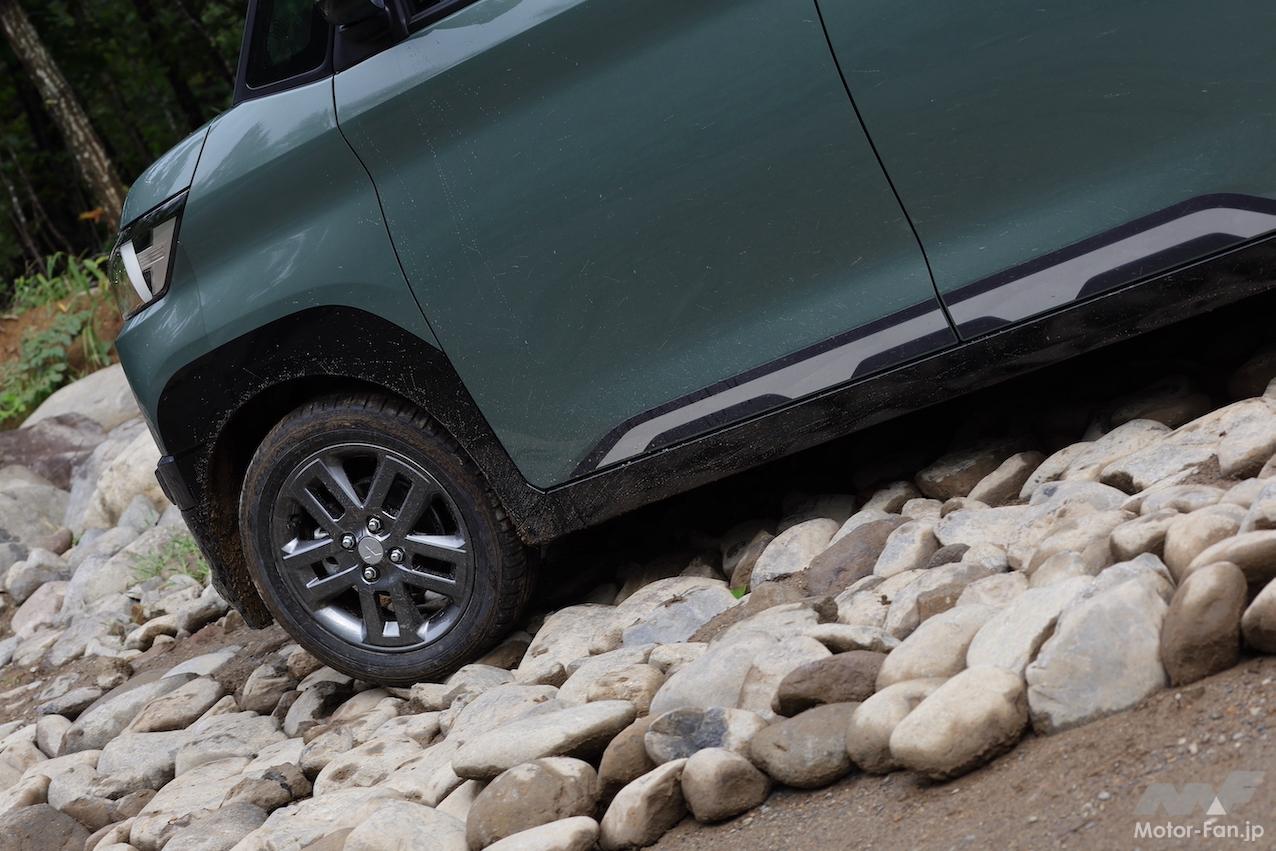 うねりやモーグルでは車体の下回りと路面が接触する場面があった。ガリッという金属質な音は心臓に良くない。デリカミニも例外ではなかったが、大径タイヤ(165/60R15)を装着する4WDは2WDに比べて実質的に地上高が10mm高い。わずかな数値の違いが大きく当たるか、擦るだけで済むかの差になる。車高の違いによる恩恵を実感するオフロード体験だった。
