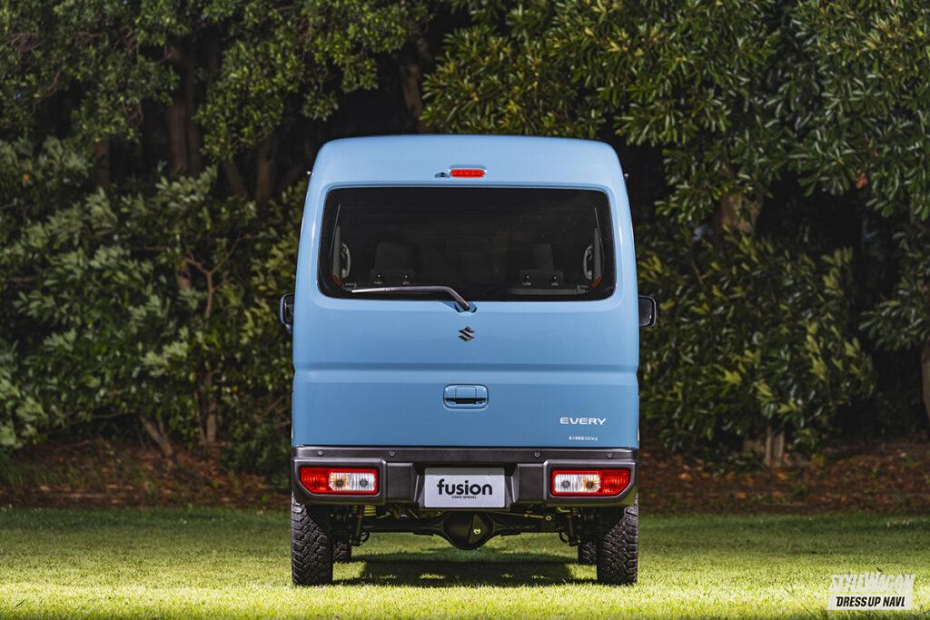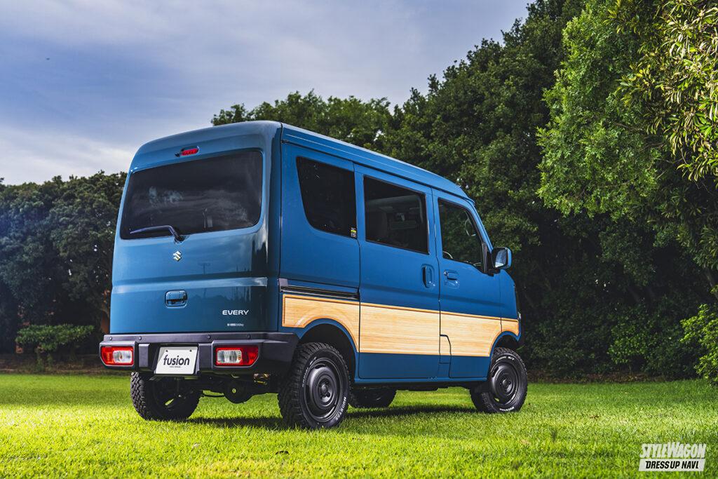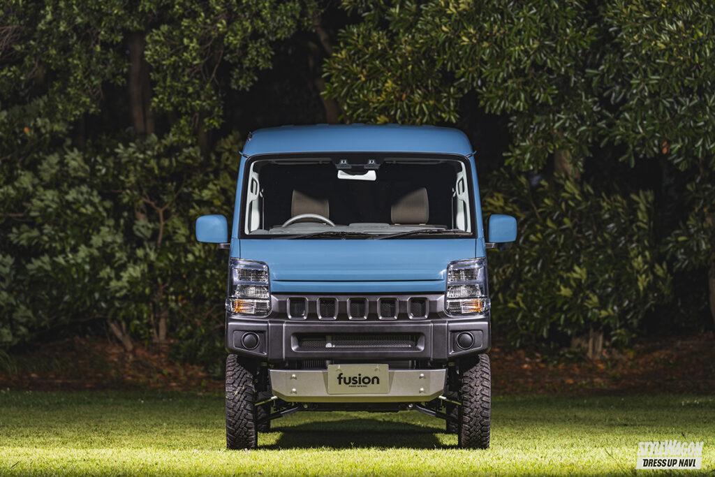 車中泊できるほど室内が広いエブリイは、クルマ旅やキャンプなどのニーズにもピッタリマッチするクルマである。オフロードカスタムのベースとしても人気があるため、ちょいアゲのリフトアップにブロックタイヤを履かせるとバッチリ決まる。だが街中でも多く見かけるスタイルだけに、もっと大きく変化を付けたい人も多いだろう。そんなユーザーに勧めたいのが、「融合」という意味を持つフュージョンのエクステリアアイテム。