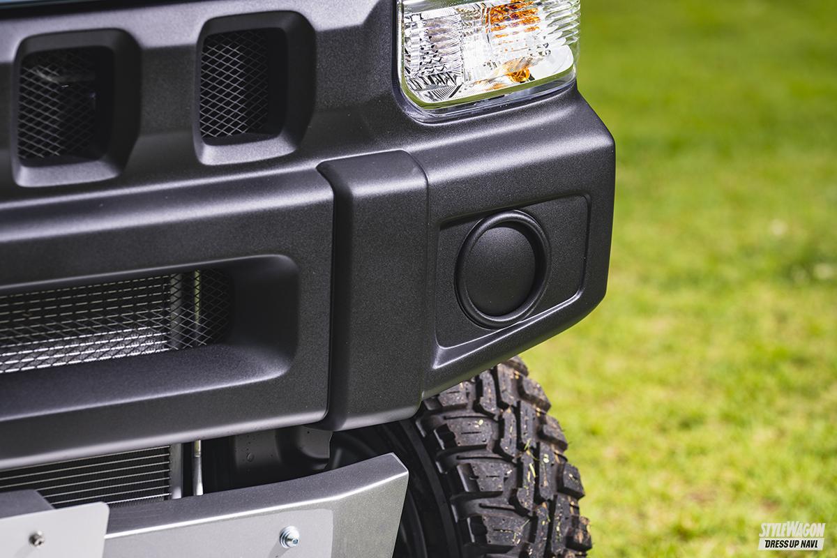 まずフロントバンパーは純正と比べると大幅にショート化されており、ひと回り大きなオフロードタイヤのアピールに絶大な効果を発揮する。それだけでは終わらず、細部のディテールを見るとピンと来た人もいると思うが、現行型のジムニー用純正バンパーをモチーフとしている。センターの開口やフォグまわりの造形を見ると非常にリアルで、しかも軽自動車規格という決められた枠の中で限界まで奥行きを付けているから質感も文句なし。バンパーと一体成型のフロントグリルもジムニーの5ホールデザインをエブリイに合わせてサイズ感をアレンジして、違和感なくジムニールックに近付けている。バンパーのショート化により下まわりが丸見えになるため、それを隠すアイテムとしてFRP製のスキッドプレートとゴツゴツした見た目のフロントバンパーガードも設定。好みに合わせてセレクトできる。そしてリアバンパーもジムニー用テールランプを装着できる設計のため、フロントとのバランスも文句なし。リアまわりの雰囲気をガラッと変えることができる。ジムニーが持つワイルドさとエブリイのウリである居住性の良さが、見事に融合した1台に仕上がる。ぜひ選択肢のひとつにしてみては?
