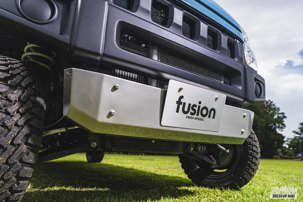 車中泊できるほど室内が広いエブリイは、クルマ旅やキャンプなどのニーズにもピッタリマッチするクルマである。オフロードカスタムのベースとしても人気があるため、ちょいアゲのリフトアップにブロックタイヤを履かせるとバッチリ決まる。だが街中でも多く見かけるスタイルだけに、もっと大きく変化を付けたい人も多いだろう。そんなユーザーに勧めたいのが、「融合」という意味を持つフュージョンのエクステリアアイテム。