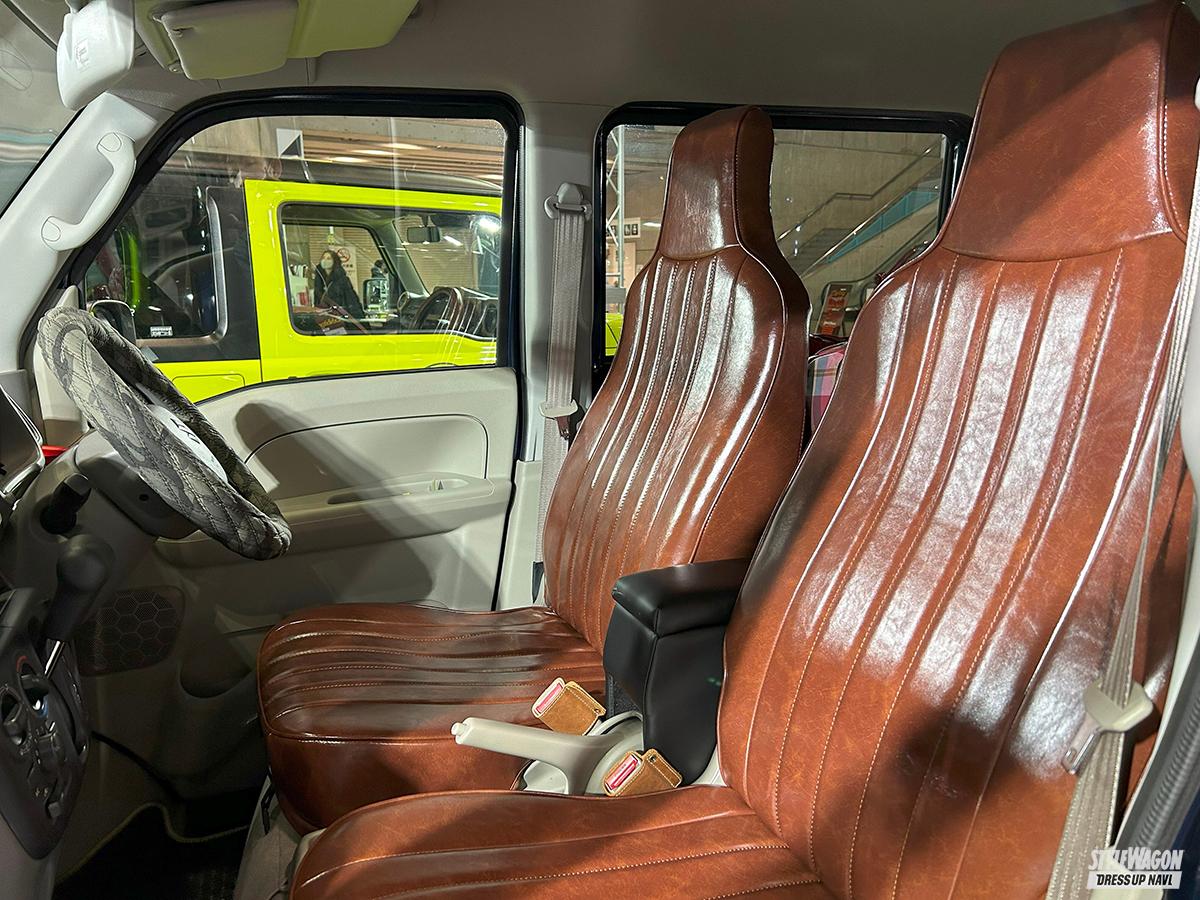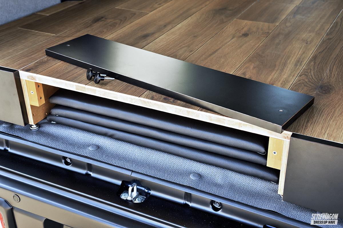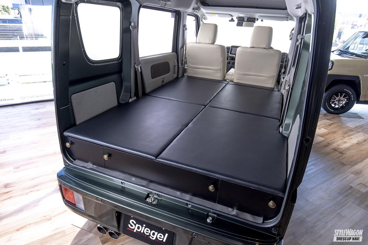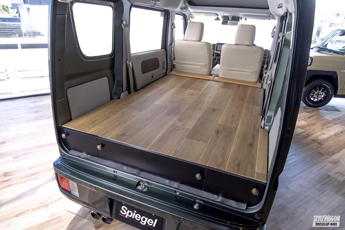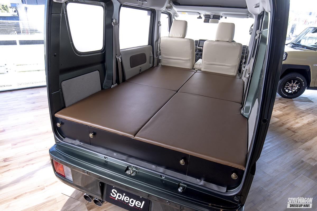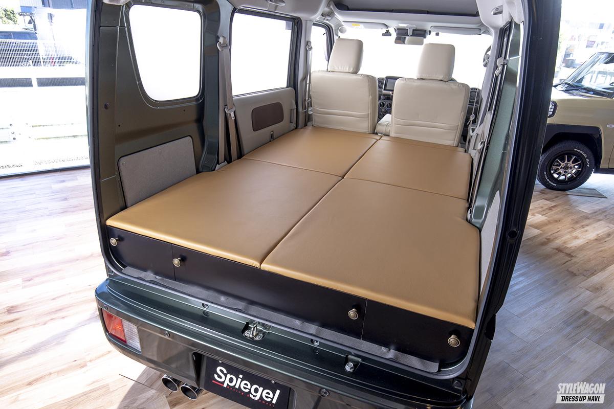 フュージョンはワイルドなオフロードスタイルのエブリイにマッチする内装アイテムも用意している。まず純正のステアリングに被せるだけでイメージが変わるハンドルカバーは、アウトドアファッションでも人気の迷彩柄を採用。自分の服などとコーディネイトするのも楽しそうだ。またオシャレなアンティーク調のレザーを採用したシートカバーも設定。本革に近いPUレザーにポリウレタン樹脂を塗布することで質感を高めている。そして姉妹ブランドのシュピーゲルからは、エブリイバン専用設計のベッドキットをリリース。マットをレスとしたフローリング調のベースキットも用意している。
