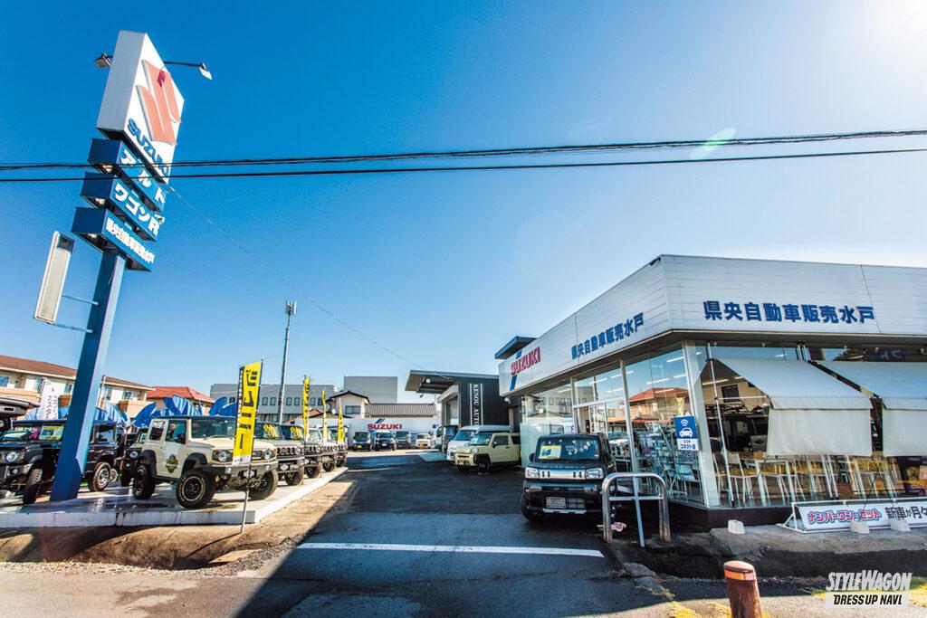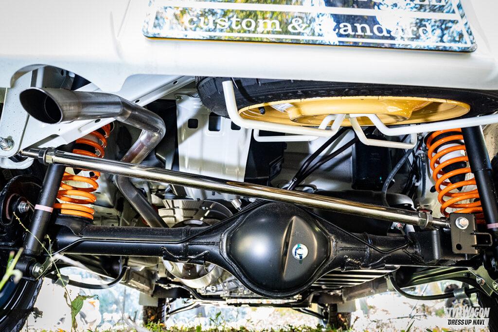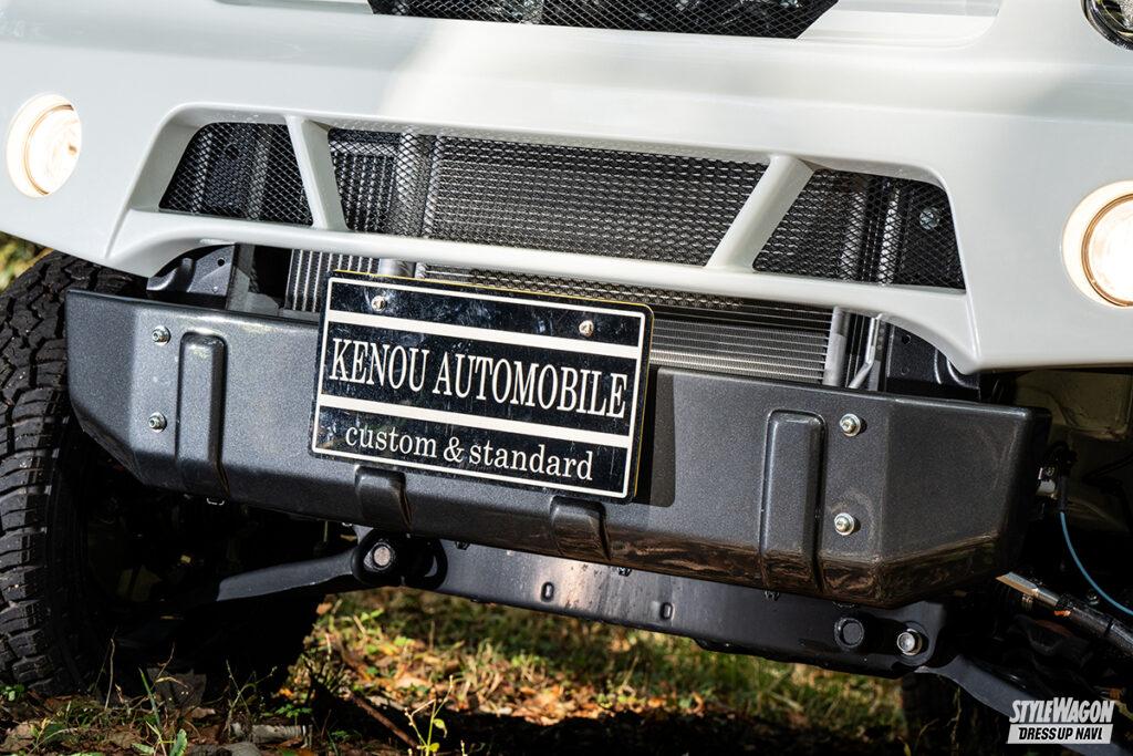装着エアロはフロントバンパー2型(フォグランプありバージョン)。1型との違いはグリル両端のガード部分だ。これがあることでタンクの目隠しになるだけでなく、吸気系にゴミや水滴が入らないという副次的効果も期待できるという。そのためいつでもきれいな空気を吸い込めるというわけだ。組み合わせたのはスキッドバンパー。リフトアップで見えやすくなってしまう腹下を隠しつつ、オフロード感を大きく高めるアイテムとなっている。ちなみにホイールは14×6.5J、タイヤは165/65-14。ゴツゴツとしたブロックタイヤも「らしさ」を高めるのに一役買っている。