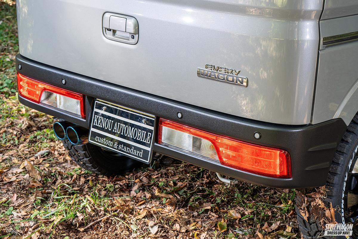 グレーのボディにバンパーのみブラック塗装で仕上げたこちらのエブリイは、フロントバンパー1型(フォグランプありバージョン)とガードバーを組み合わせ。1型バンパーはグリルのダクトが左右いっぱいに広がっているのが特長だ。そのため、左右に広くワイドな表情を作り出してくれる。なお、フォグランプは純正を利用。スキッドプレートのみとは異なり、パイプ状のガードバーにすることでひと味違ったオフロード感にしているのもグッド。なお、こちらの車両ではリアバンパーもオリジナルを装着。フロント同様大きくショート化されているため、リアタイヤもまるっと見えるようになる。